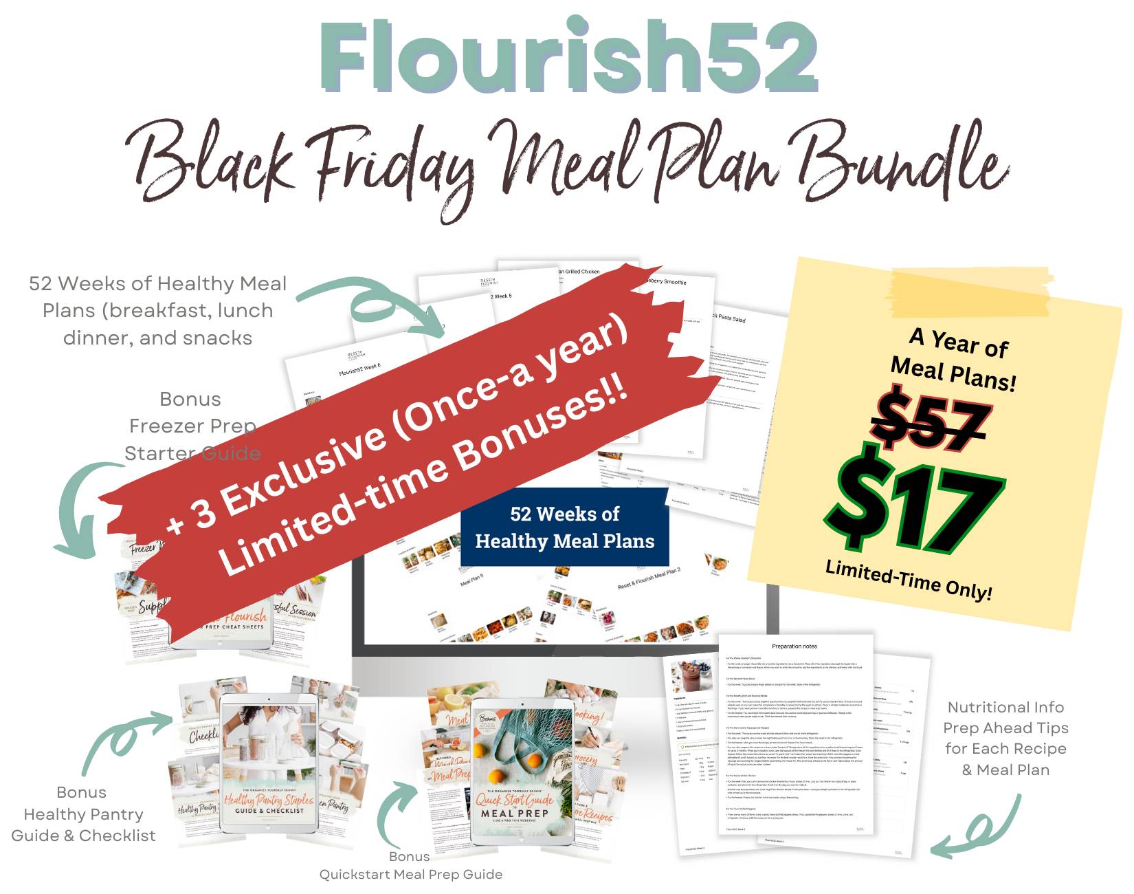 ✅ Flourish52: 52 Weeks of Done-For-You Healthy Meal Plans – breakfast, lunch, dinner, and snacks planned for you all year, complete with grocery lists and prep tips.
