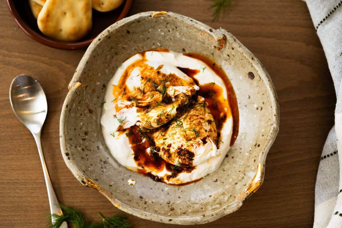 #4 Turkish Eggs A traditional Turkish breakfast dish made with creamy lemon garlic yogurt, perfectly poached eggs, and spiced chili butter.