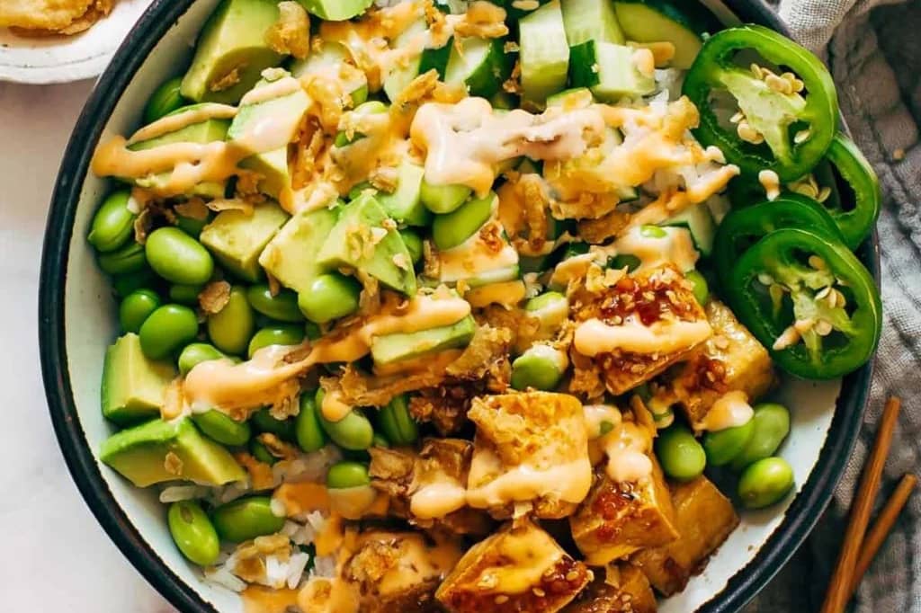 Another storebought sauce FTW! Crispy tofu doused in teriyaki, lots of veg and buttery avocado, spicy mayo drizzles, and (wait for it) - CRISPY ONIONS!