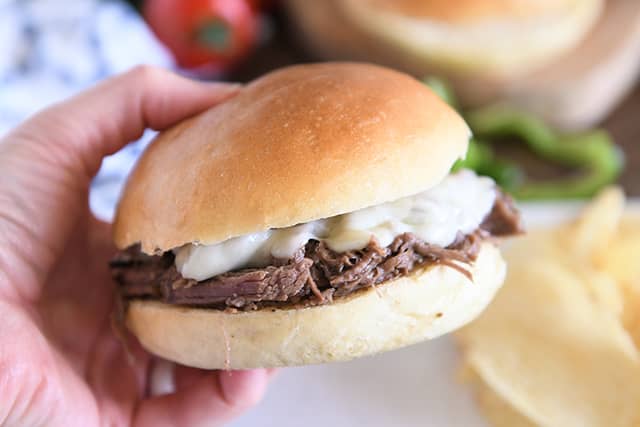 This is another great make-ahead meal since the beef cooks in the slow cooker all day. It is delicious on store bought buns or these homemade buns. Serve with fresh fruit and/or veggies and chips or crackers.