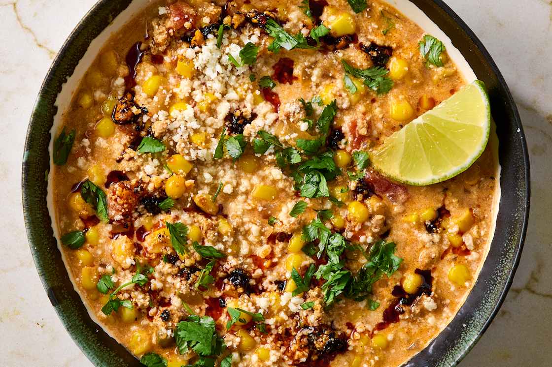 Then we'll get a dose of cheesy carbs with our classic Baked Spaghetti. I'll doctor up a jar of Rao's with sautΓ©ed onion and garlic — it's a dish the whole family will devour. Next up is our Roasted Tomato Soup, which many readers claim is the best tomato soup they've ever tasted (honored!). Then we'll dig into Janette's new Mexican Street Corn Chicken Chili, which has all the flavors you love in the classic snack, transformed into a meal with ground chicken.