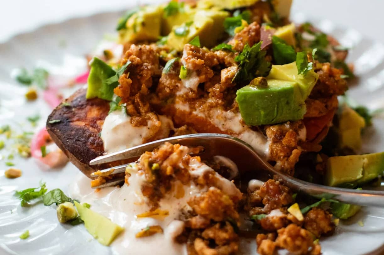 There's something for everybody here! It has truly been such a win with my whole family. Roasted sweet potato halves, crumbled taco-seasoned chicken, and a creamy chipotle sauce that I could eat straight with a spoon.