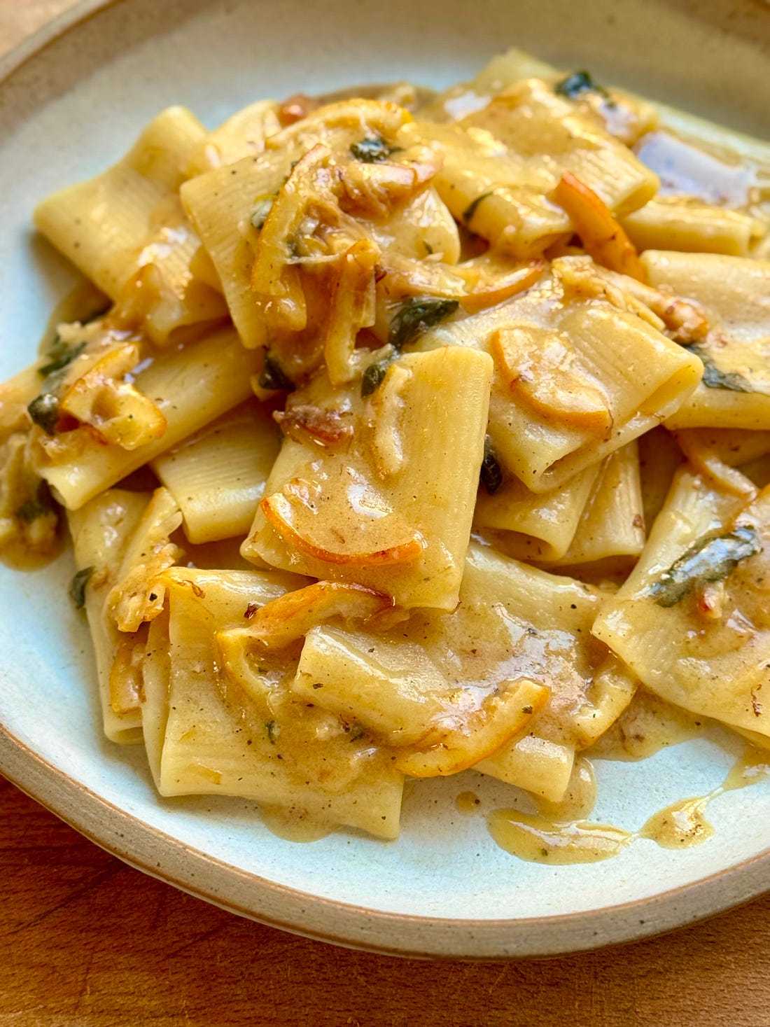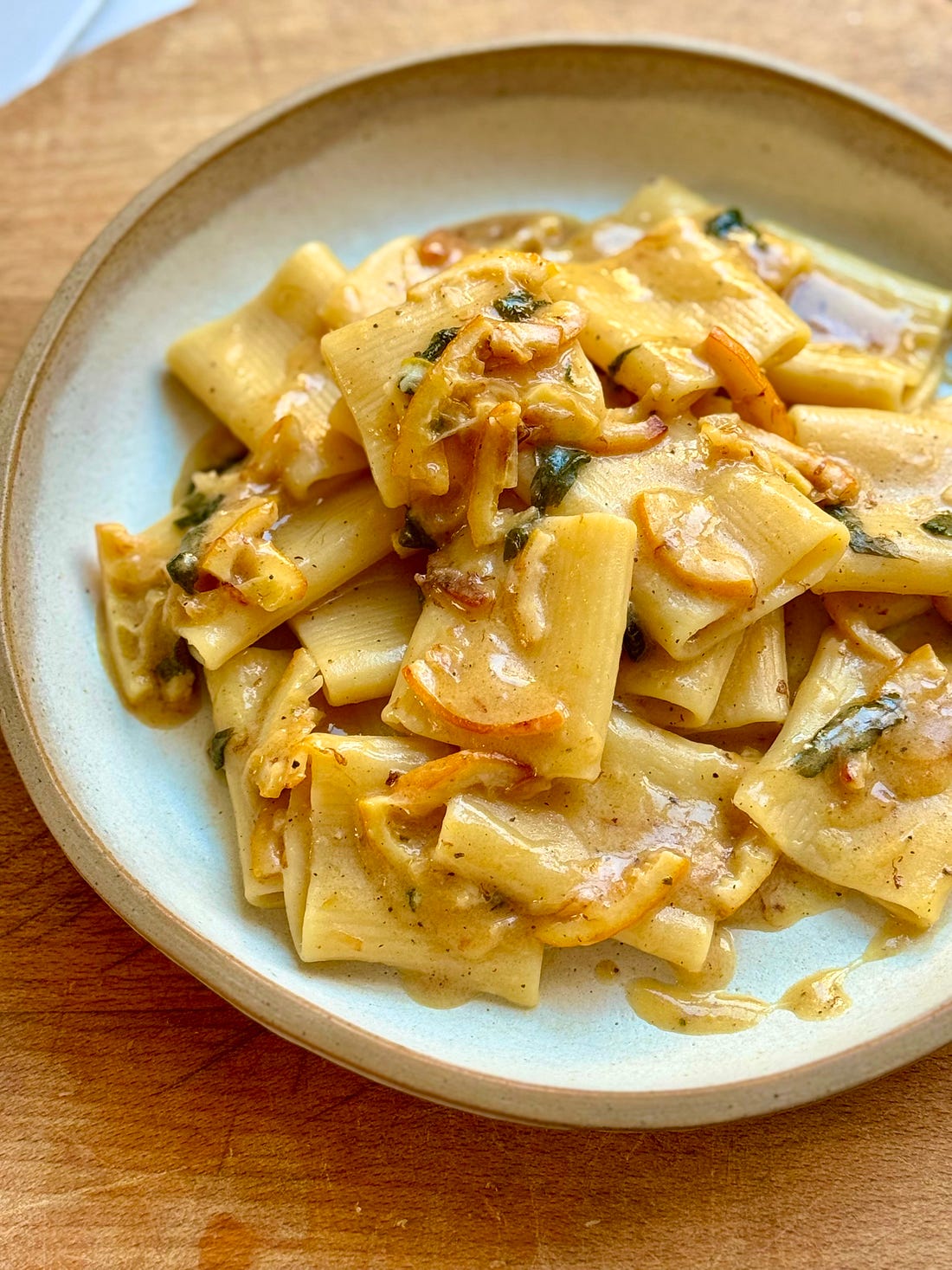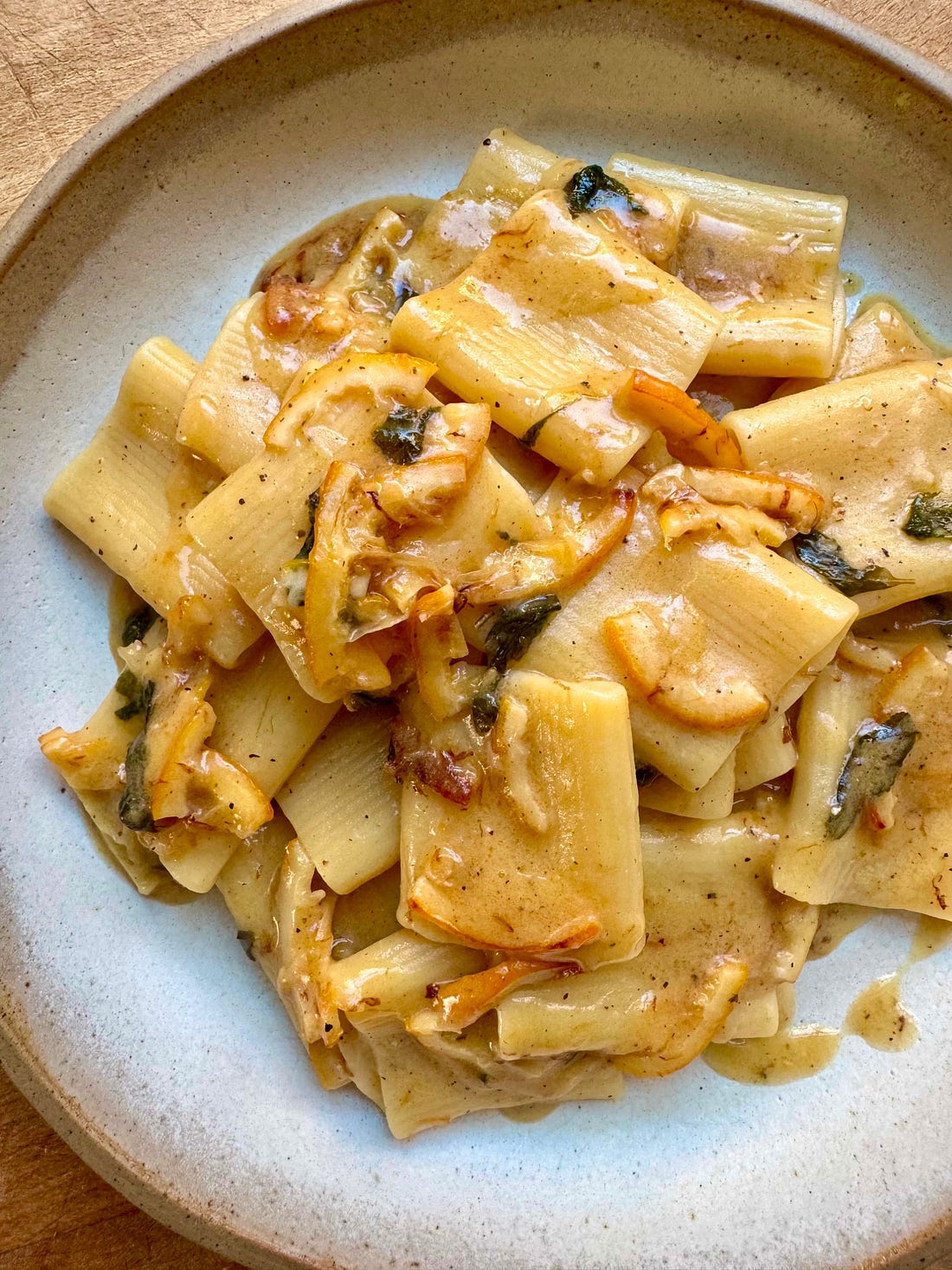 Brown Butter Paccheri (or Rigatoni) with Sizzled Lemons and Sage I used paccheri (the large tubes) for this, as that’s what I had, although you want the ridged ones so that they hold onto the sauce. Rigatoni is an otherwise safe bet and is what I’d have used sans paccheri. 350g ridged paccheri or rigatoni pasta Bring a small pan of water to a boil for the lemons, and a larger one for the pasta, adding a generous amount of salt to the latter. Quarter your lemon, trim off the pointy ends, then slice the quarters thinly, removing any pips and tough bits. Cook the lemon pieces in the small pan of boiling water for 4 minutes, then drain. Don’t skip this step as it’s essential to remove bitterness from the lemons. Drain and pat dry. Cook your pasta in the large saucepan of boiling water until it’s a bit too al dente (a couple of minutes away from being done). Melt the butter over medium heat in a wide, high-sided frying pan - preferably a light coloured one so that you can easily see the colour of the butter. Once melted, add the lemon slices and the sage leaves and cook, stirring gently (it will splutter at first) until the butter has browned, the lemons are starting to caramelise, and the sage leaves have crisped - 5-7 minutes. Once this has happened, use a slotted spoon to remove all the lemon slices and sage leaves from the pan, then return about half of them, reserving the other half for later. Transfer the pasta into the frying pan using a slotted spoon or pasta claw, along with a full ladle of the pasta cooking water, the Parmesan, lots of black pepper and some salt. Toss and stir the pasta enthusiastically until the sauce starts to thicken, then add another full ladle of pasta water and continue doing the same. You’ll likely want a bit more sauce, so go ahead and add another almost full ladle of pasta water and continue tossing and stirring until you have a luscious, thick sauce that’s clinging to the pasta. Spoon into bowls, adding the reserved lemon pieces and crispy sage leaves on top. Add more black pepper and cheese, too, if you like. Enjoy!