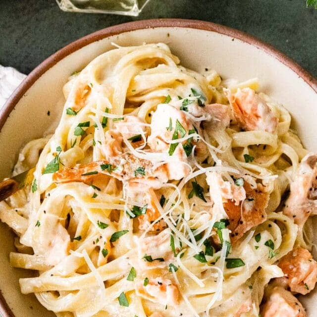This is a delicious twist on chicken Alfredo with tender, flavorful bites of salmon!