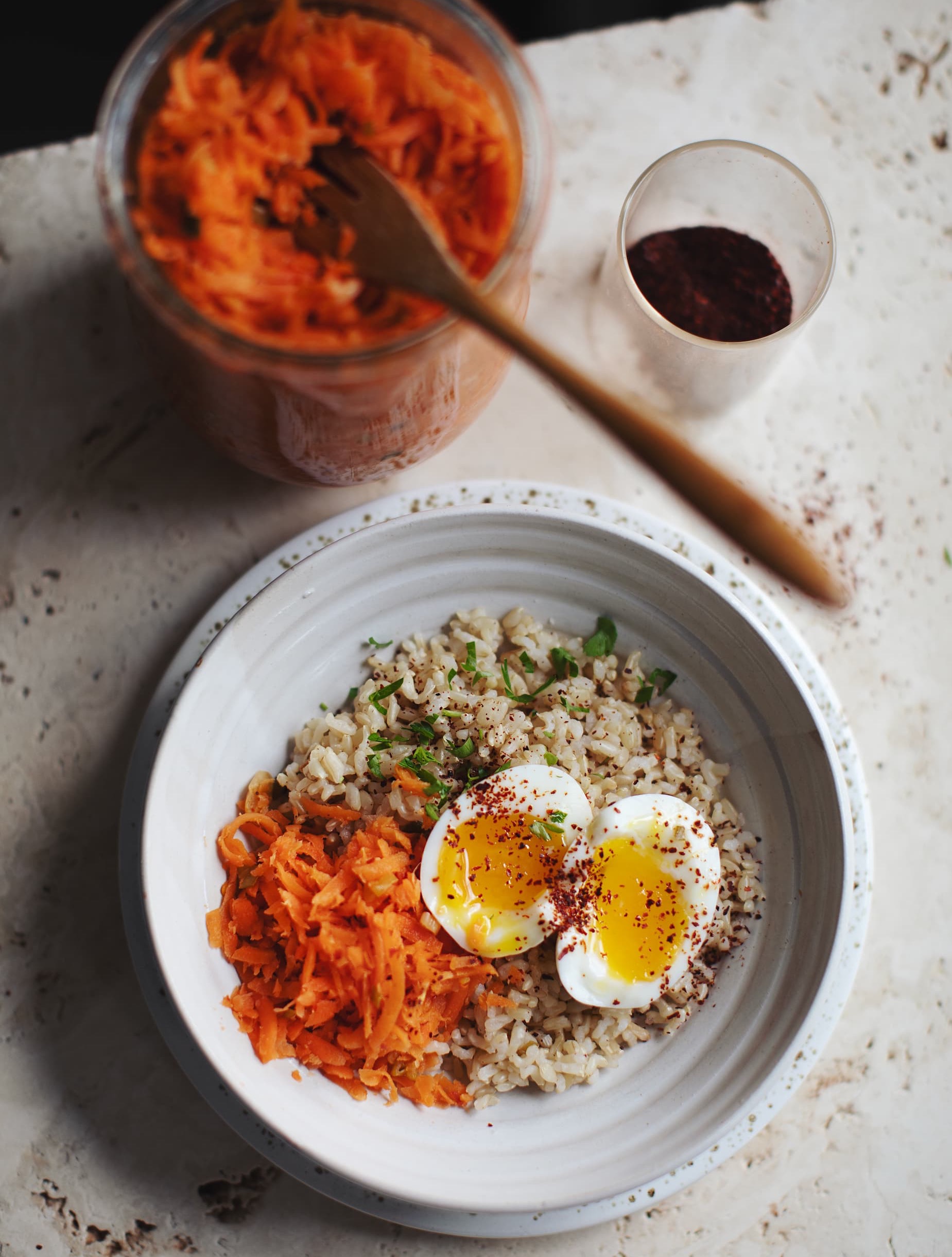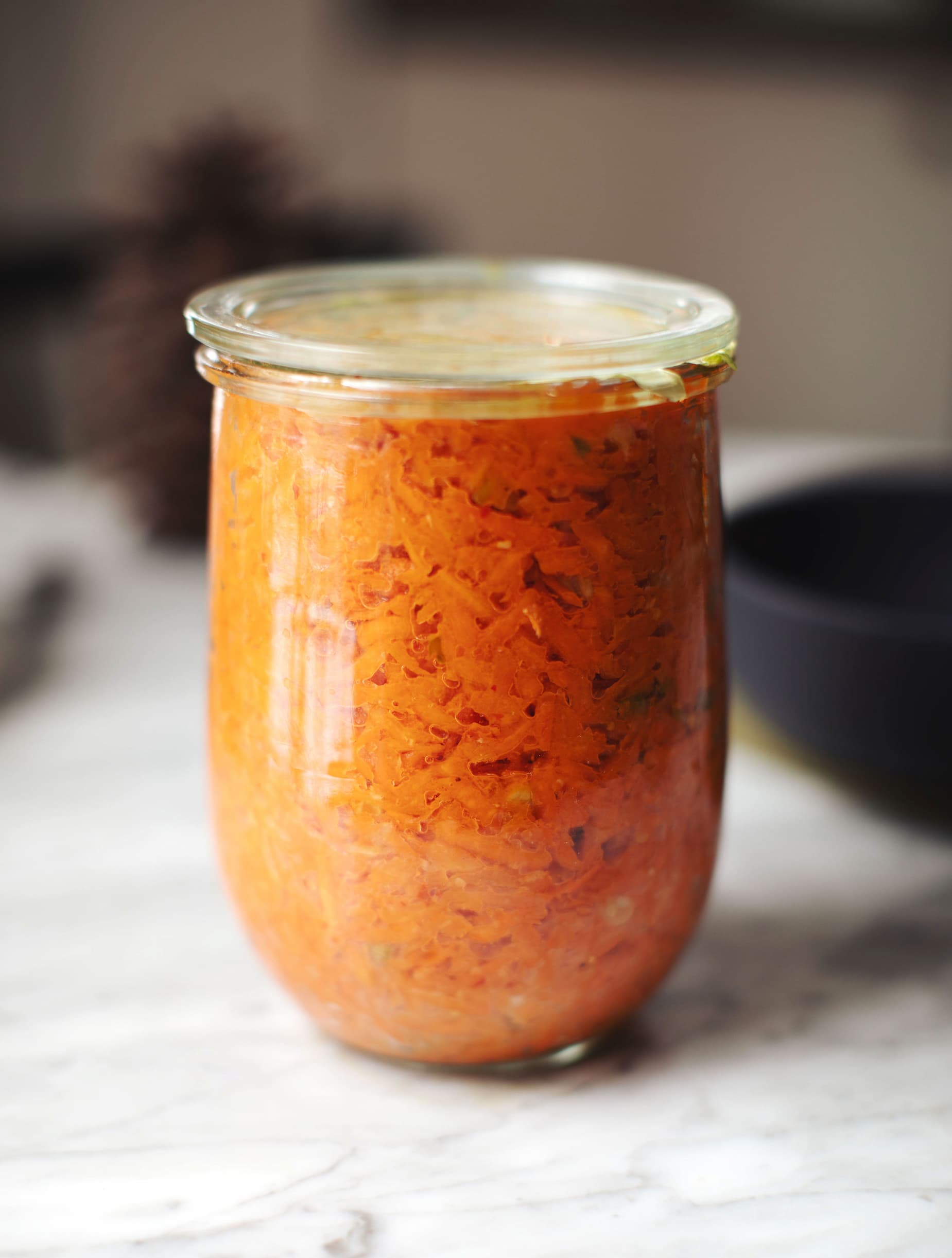 Tanggun refers to carrot-based preparations that are often quicker-fermenting and more flexible than traditional cabbage kimchi. These versions reflect the adaptive nature of Korean fermentation - food that responds to circumstance rather than rigid rules. In home kitchens, kimchi is constantly adjusted: ingredients substituted, spice levels altered, batches made small or large depending on need. Carrot kimchi fits squarely into this lineage of intuitive, household fermentation. Sharing carrot kimchi in January feels especially aligned with its roots: a preserved vegetable made to nourish through winter, shaped by time, microbes, and care. It's a reminder that fermentation is not about perfection or purity, but about relationship; to season, to culture, and to the quiet intelligence of food that knows how to sustain us. | | INGREDIENTS 1 kg / 2.2lbs. carrots 22g / .77 oz fine sea salt (about 2% salt by weight) 5 spring onions 20g / .7 oz fresh ginger 4 fat cloves garlic 1-2 Tbsp. gochugaru or chilli flakes DIRECTIONS 1. Peel the carrots. Grate, slice, or julienne them - alternatively, you can pass them through the shredding blade of your food processor. Place them in a large bowl, sprinkle salt over top, fold to coat and set aside. 2. Slice the spring onions (use both white and greens parts). Peel the ginger, garlic and mince both. Add these to the bowl of carrots, along with the gochugaru / chilli flakes. Fold everything together, then massage well until you start to see liquid at the bottom of the bowl. 3. Once there is enough juice (if not, keep massaging), transfer the mixture to a sterilized jar (or two), pressing down firmly as you pack to remove any air bubbles. It's important that the liquid covers the top of the veggies. If you have a fermentation weight, use it. Otherwise, just make sure that there isn't anything popping up above the liquid line. 4. Lightly cover the jar and place on a rimmed plate in a spot out of the sun, but not too cool. 5. After five days, try a little of the mixture to see if it's to your taste. If not, you can keep fermenting for up to ten days, as it will continue to get more tangy and complex in flavour. 6. Once the batch is to your liking, seal with an airtight lid and place in the fridge where it will keep for several months. Always use a clean utensil to take from the jar. 7. Enjoy on the side of your meals, tossed into salads, topping sandwiches, or mixed into yogurt or mayo for a delicious spread! | | | | |