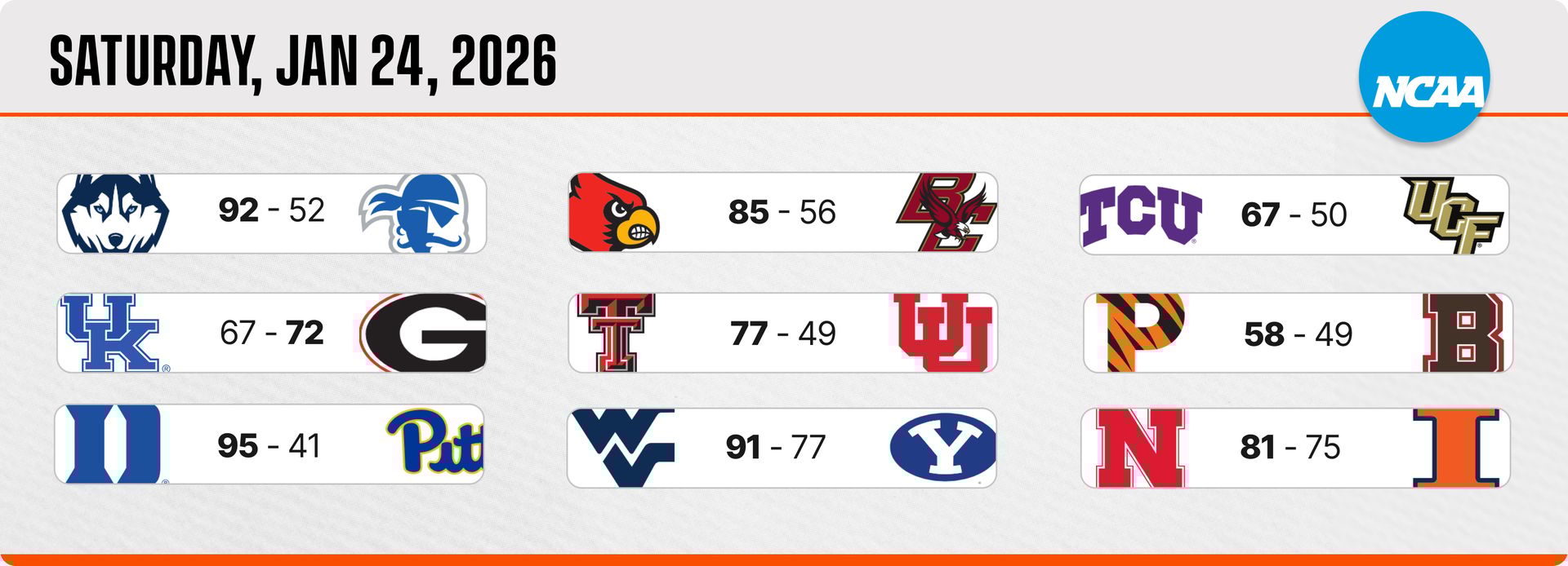 | | | Geno Auriemma absolutely lashed out at his team after a slow first quarter, and it paid off as the Huskies rolled to a decisive 40-point win over Seton Hall. While all the ranked teams cruised past unranked opponents, Georgia pulled off an upset over Kentucky in a statement win. TCU's victory moves them into a tie with Baylor for the conference lead. Nebraska finally snapped a three-game losing streak with a win over Illinois.