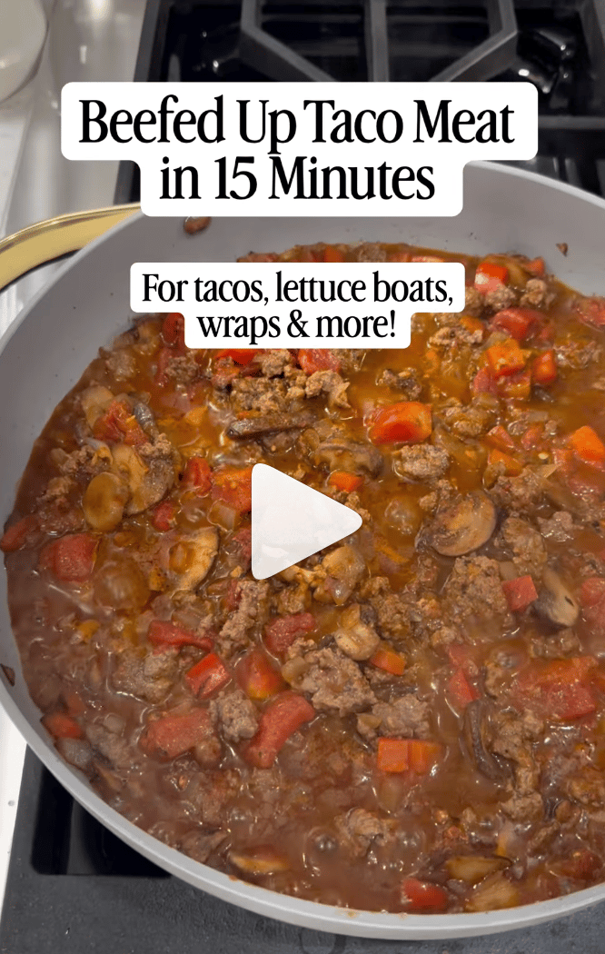 Beefed Up Taco Meat 🥩🌮 is how you can beef up (pun intended 😂) a pound of ground with extra veggies so you've got high protein + veggies for nutrients and fiber so you can STRETCH the meat over more meals or more people and make it more nutrient dense! Easy one skillet recipe that's ready in 15 minutes to use in tacos, burritos, salad bowls, lettuce wraps and more!