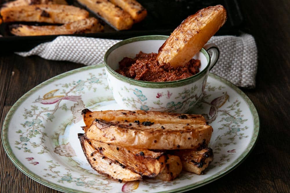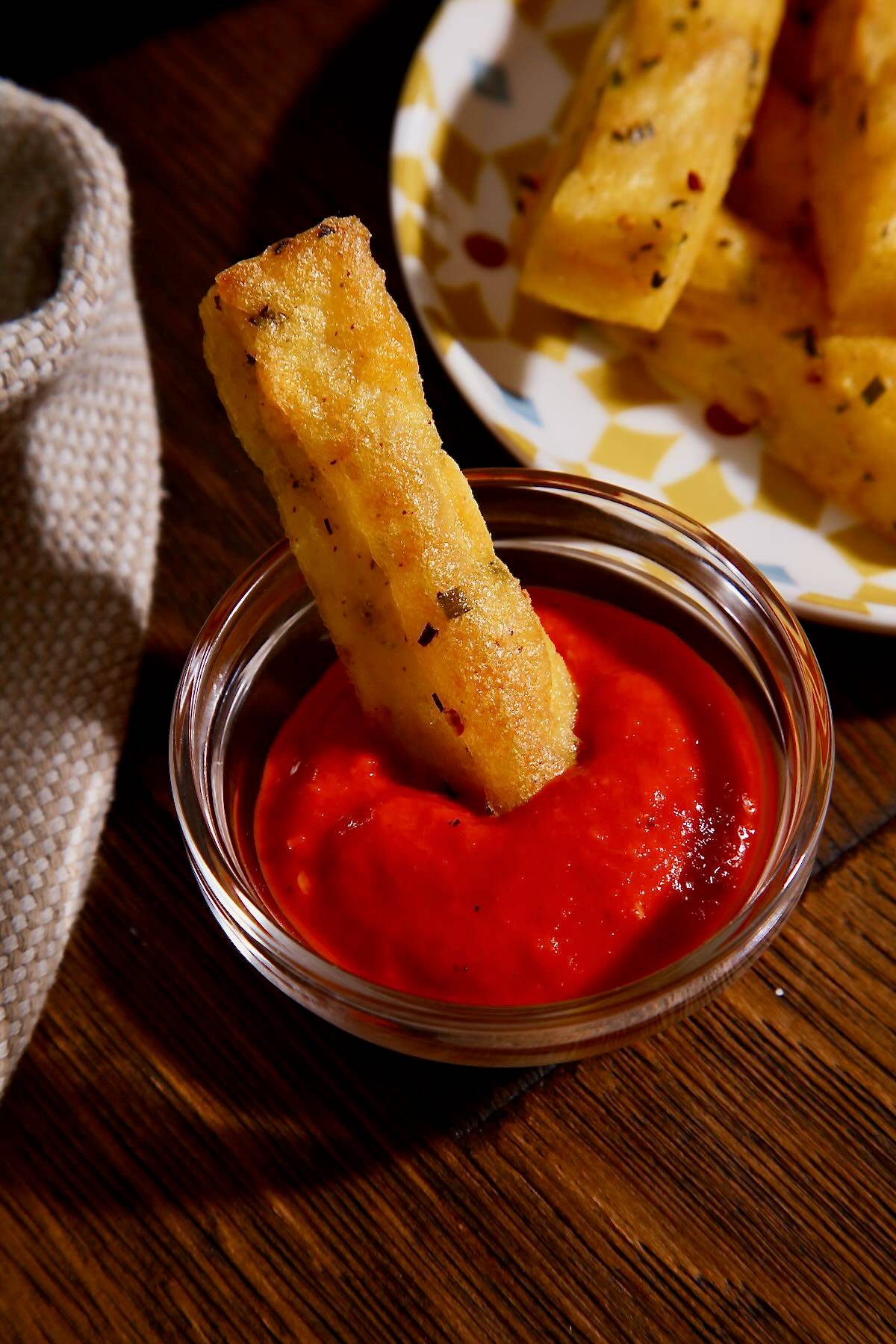 I've been baking these crispy polenta fries on repeat! They are golden on the outside, soft and fluffy in the middle, fragrant with rosemary and with a gentle warmth from chilli. They're the sort of thing that disappear at an unseemly speed once they hit the table.