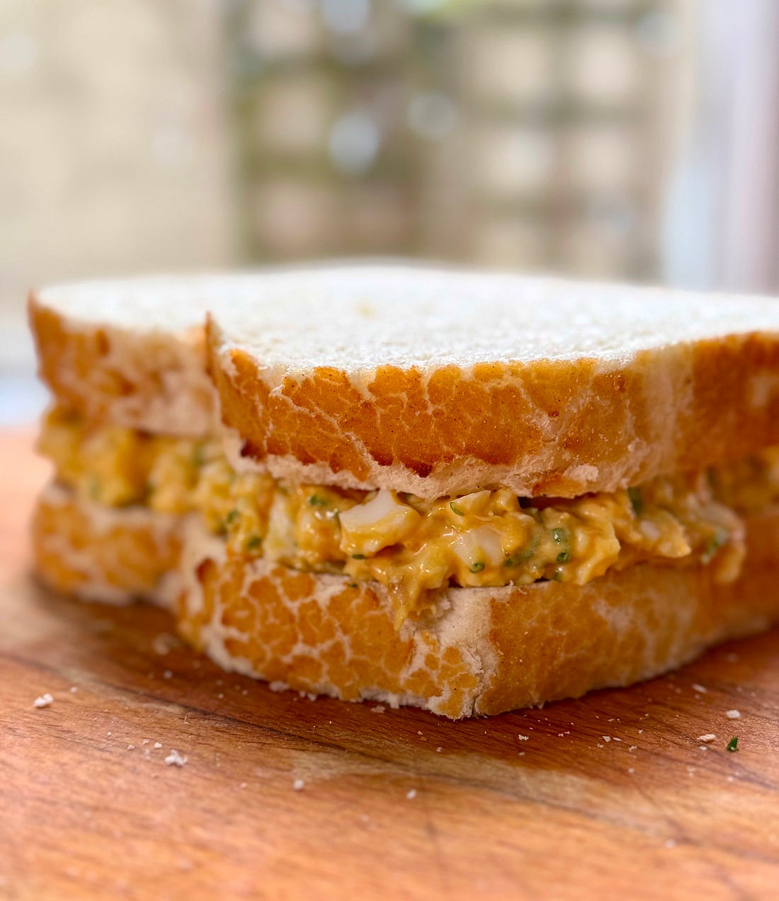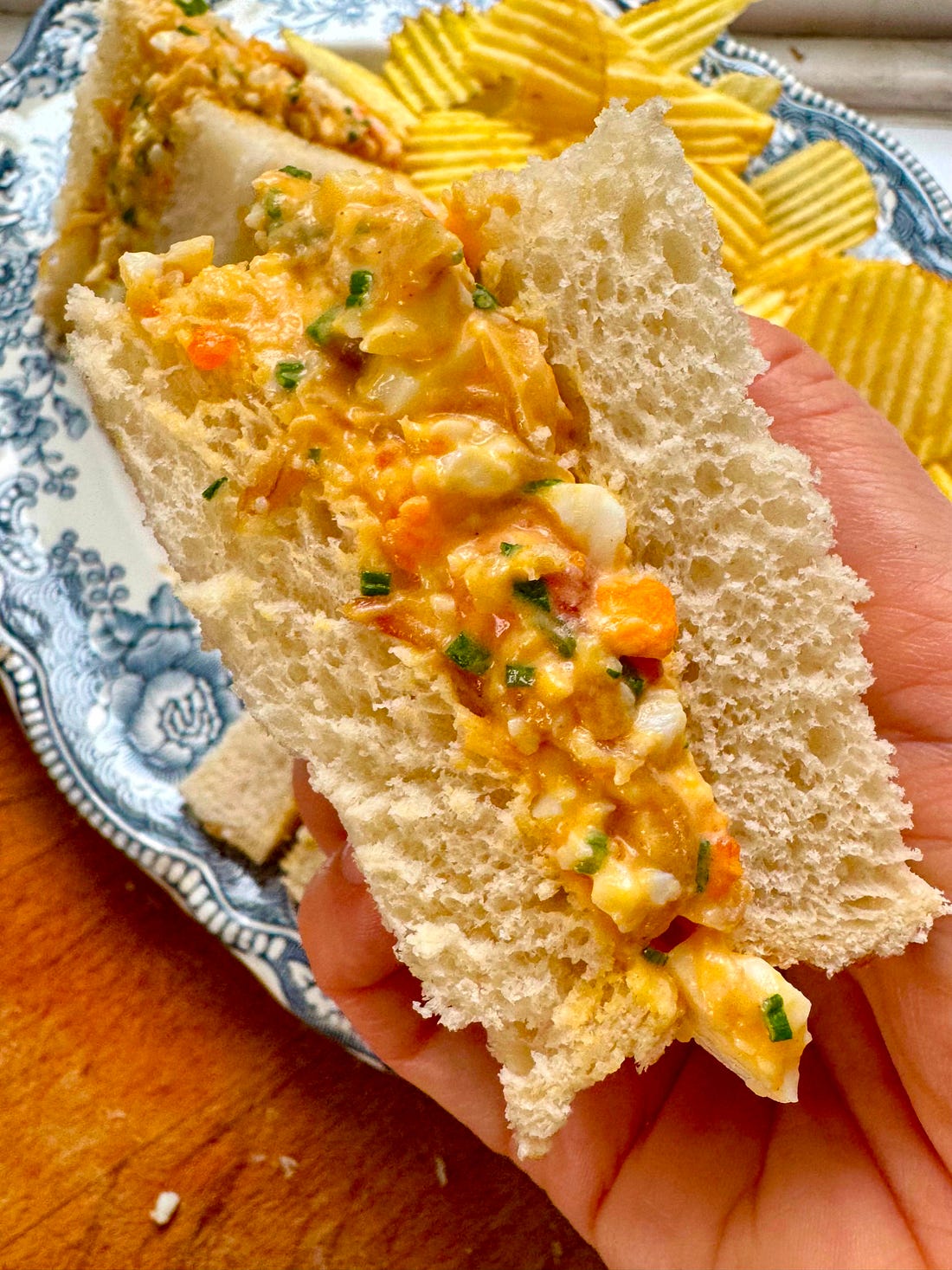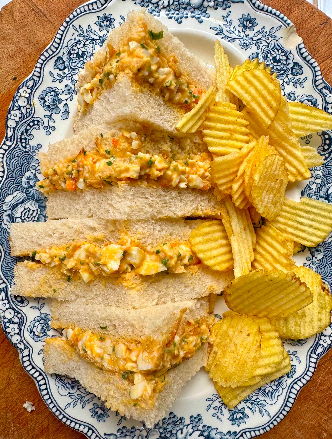 Caramelised Onion Egg Mayo 6 eggs Make your batch of caramelised onions as per the instructions above. Of course, you could make smaller batch if you don’t want as much on hand. I would, at most, halve the quantities because the onions shrink a lot and it’ll be annoying when you’ve got barely anything left. Cover your eggs with cold water and bring to a boil. As soon as the water starts to boil, set a timer for 5 minutes and 30 seconds. Once the time is up, remove and place in a bowl of cold water. Once cooled, peel the eggs and mash them together with the mayo. Season with salt and a generous amount of Sarson’s and white pepper, then taste and adjust as necessary. You’re going to need to season this highly with salt, vinegar and pepper. Stir through the chives. I don’t think I need to tell you how to make a sandwich with this! But BE GENEROUS. And put the crisps in the sandwich!