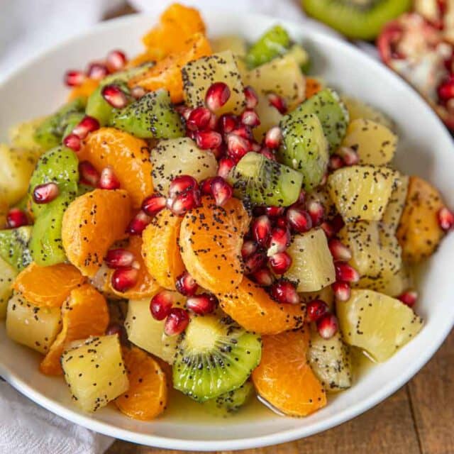 One of the easiest and tastiest ways to take advantage of seasonal flavors is with this winter fruit salad featuring sweet and tart kiwi, pomegranate, oranges, and more.