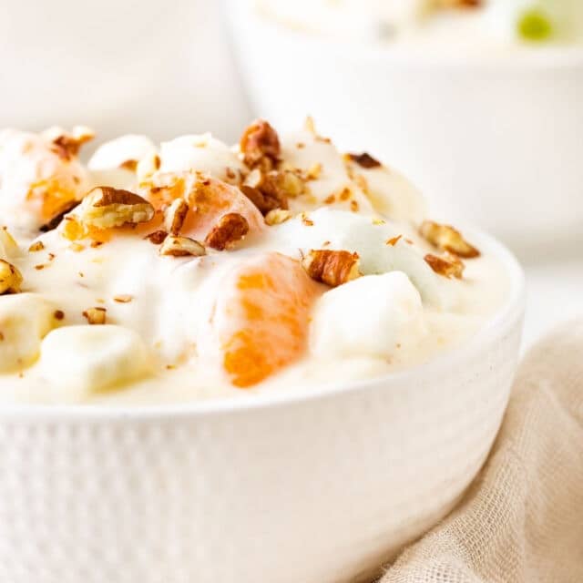 This fruit salad makes a sweet treat with a sweet, fluffy dressing covering delicious fruits like mandarin oranges, pineapple chunks, and banana slices.