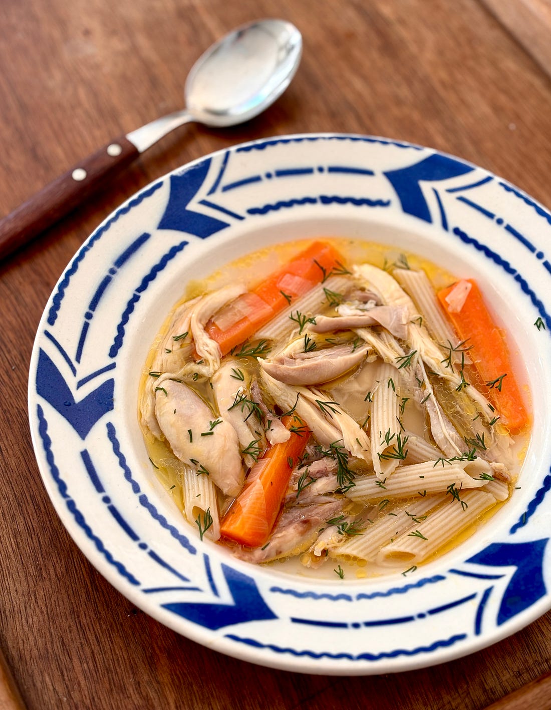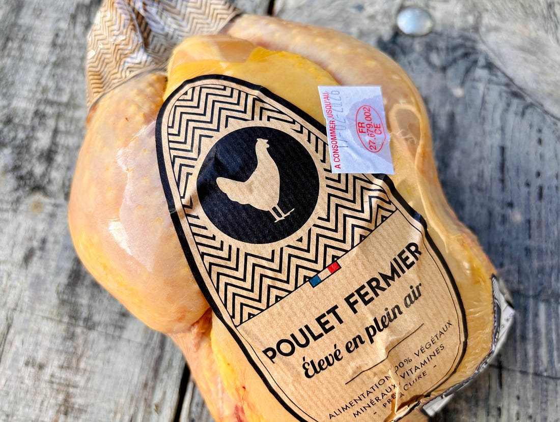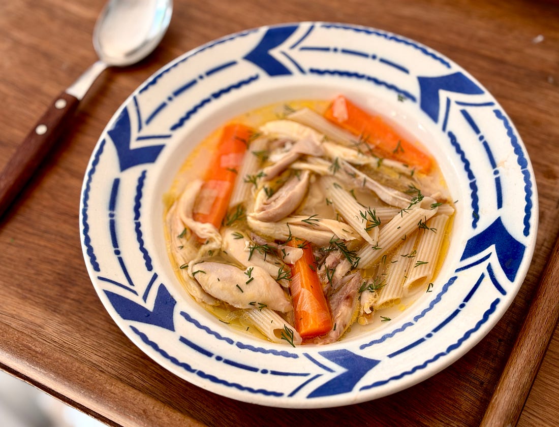 Well, le gastro got me again. Because le gastro is so common here in the winter, and French is so complicated to speak even for native French speakers, the name gets shortened from gastro-entérite, or gastroenteritis. Being densely populated, Paris is a petri dish for it, although some guests were in the French Alps last week, and four out of six of them got felled by it. So escaping to the mountains doesn’t ensure that it won’t find you there. I had it about a month ago, and just got it again, which doesn’t seem fair, although as I recently heard a doctor say, viruses don’t care about your feelings. Le gastro is very contagious and the best defense is washing your hands. (Hand sanitizers aren’t that effective against the virus.) Unfortunately, in a country where greeting someone involves shaking hands, and daily life entails holding onto poles in crowded métros, eating in restaurants and shopping at markets where multiple people have handled your food, and towels for drying your hands after washing them in some restaurants and cafés are shared with perhaps a hundred or more people*, you don’t need to look very far to see how (or where) you could have gotten it. One thing about getting sick in France is that you have to plan for it. There’s no pre-prepared chicken soup, and supermarket soups are invariably veloutés or purees of vegetables. I don’t know about you, but when I have an upset stomach, the last thing I want is a bowl of green soup, especially if you’re old enough to remember Linda Blair in The Exorcist. When things are coming out of you fast and furiously, you want a bouillon-based easy in, easy out situation. And certainly not anything green. Newcomers to France, from America, are surprised to find that store-bought bouillon or stock isn’t readily available in liquid form, as it is in the States, where whole aisles of the supermarkets are devoted to a range of stocks sold in quart cartons. In France cubes of stock are commonly used, from brands like Knorr, and Maggi. Ultra-processed hasn’t become a keyword in France yet, but I’ve yet to make the transition to them. I’m not sure what people in France do when they get sick, but if you can drag yourself to the grocery store, or can manage a trip to both the butcher and the produce store, you can make a poule au pot.** This “chicken in a pot” requires little hands-on work, and is easy on the system, one that I’m doing my best not to upset any further. There are fancy ways to make a poule au pot, such as one with a sauce suprême made with crème fraîche, egg yolks and butter, or this one, with 14 ingredients. Or this one with chicken stuffed with a farce (stuffing), which you’re welcome to tackle if you’ve got the fortitude for it. There may be a definitive version of poule au pot, but I’m too zonked to track it down, nor am I up for a battle with the authenticity police. And I’m definitely not up for*** stuffing a chicken, or making or eating cream sauce. The good thing about making this dish is that you don’t need store-bought stock as cooking a whole chicken gives you a lovely, rich broth. And while not part of the French culinary canon, since Manischewitz has not made it to France, there’s no matzoh meal at the supermarché. Yes, you can buy pain azyme and grind it yourself, but that also takes strength, so it’s a no-go. My neighbor who owns a deli in Brooklyn is out of town. Otherwise I’d ask him to bring some matzoh balls over. I’d be pretty surprised if he didn’t have some matzoh meal squirreled away. Armed with my shopping list, after Romain came back from the store, I placed the free-range chicken in a pot. I added enough cold water so it covered about three-quarters of the chicken, then added some salt as well as a chopped leek and three carrots cut into thick batons. Fortunately we have a garden so I grabbed a few sprigs of thyme and tied them in a bundle to add to the pot, as well as two bay leaves. Garlic is used very discreetly in French cuisine; with the exception of aïoli, which technically is Provençal - and some in Provence may argue that that’s not French cooking, that it’s Provençal. (Once again, I’m not looking for a fight. I’m just being diplomatic.) Few, if any, poule au pot recipes in French call for ail — doing an online search, the only ail I found in poule au pot recipes was in the word volaille, which means chicken. I added four minced cloves of garlic, which the authenticity police may not approve of, and even Claude AI was baffled by the request. And into the pot that went, as the health benefits of garlic outweigh any cultural conflicts. Everything was simmered over very low heat with the lid ajar for about 90 minutes, until the chicken was very tender. About halfway through the cooking, I used tongs to pull the thighs away from the breasts to help the broth get more infused with flavor. (That may not be scientifically provable but I have a feeling that it does.) Once the chicken was cooked, I fished the pieces out with tongs and put them in a bowl to cool. When cool enough to handle, I shredded the meat and put it back in the pot. And that’s it. If you want to add rice or noodles****, as I did, it’s best to cook them separately and add them to individual servings right before serving, or they’ll get soggy. Fresh dill is an add-on that’s no common in France, but Romain likes it (as do I), and picked some up at the store. It adds a nice flavor to the soothing soup. *Many restrooms in France, such as those in restaurants and cafés, have a cotton towel on a hook for people to dry their hands on after washing them. That may save paper, but to me, seems to defeat the purpose of washing your hands. Although perhaps the feeling is that is everybody is washing their hands, before drying them on the towel, the towel isn’t harboring any germs or viruses. **You’ll find recipes for soupe de poulet and soupe au poulet, that are ba