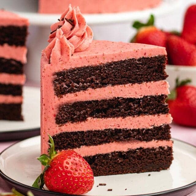 You'll love this delicious Valentine's dessert with 4 layers of moist, dark chocolate cake topped with fluffy strawberry buttercream.
