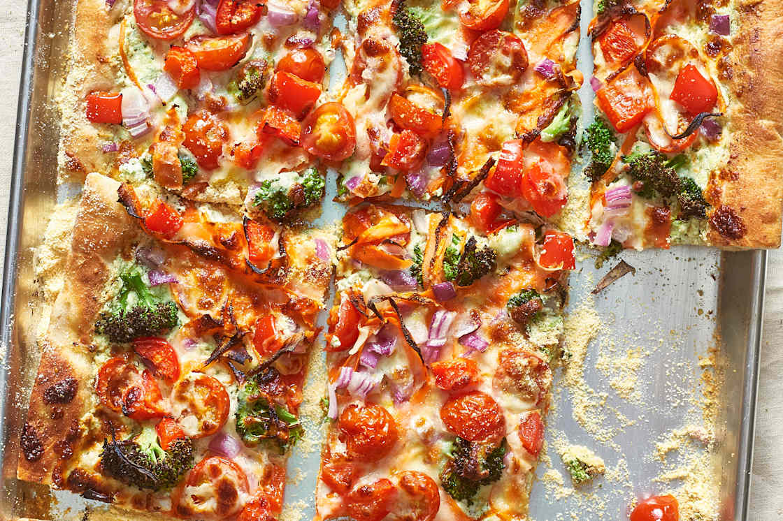 We'll get cozy with our copycat version of Olive Garden's beloved chicken gnocchi soup, which tastes like the real deal. I'll serve it with garlic bread, but (yes) breadsticks are obviously always an option. I'm always wondering why I don't make pizza at home more — I just love my local joints so much! — so I'm going for our Veggie Supreme, which bakes right on a preheated sheet pan (supreme crispiness) and has a ricotta-pesto sauce. Say less! |