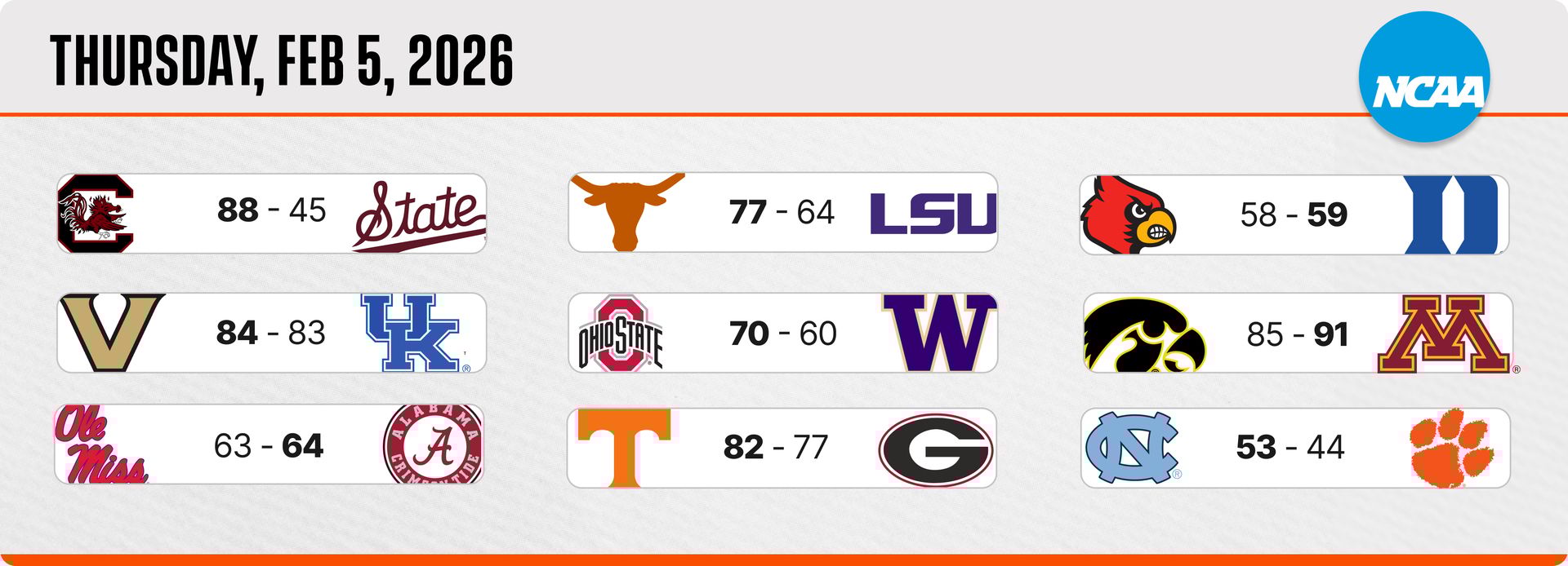 | | | What a day it was in the SEC. A revenge game, an overtime thriller, and two upsets combined to shake things up in a big way. Concern continues to grow for the Hawkeyes. Iowa lost its third straight, giving up a season-worst 91 points to the Gophers. Two undefeated ACC teams finally met, and one had to fall. Louisville couldn't capitalize on home-court advantage as the Cardinals saw their perfect run snapped. The Lady Vols needed a way to stop a two-game losing skid, but a trip to face a solid Georgia team wasn't easy. Still, Tennessee got the win it desperately needed, even if it took overtime. Ohio State's road win over Washington marked its first road victory against any of the four West Coast teams that joined the Big Ten last season. After losing two straight, North Carolina has found its rhythm again, extending its winning streak to six.
