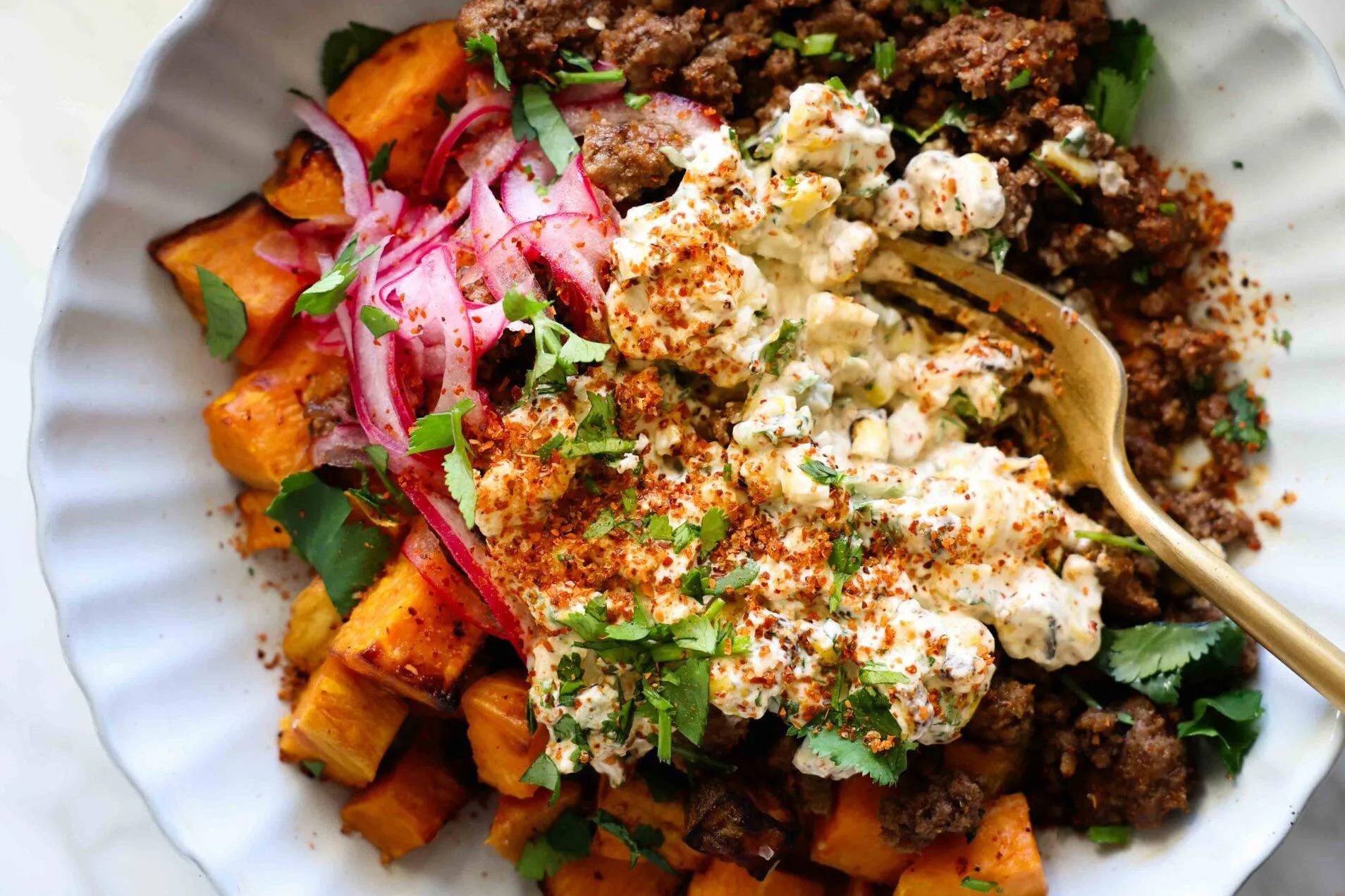 Crispy chicken tenders brushed with a jar of tikka masala sauce, a fresh cucumber crunch with a creamy slaw, and quick-pickled onions. WOAH. This is such a good one.