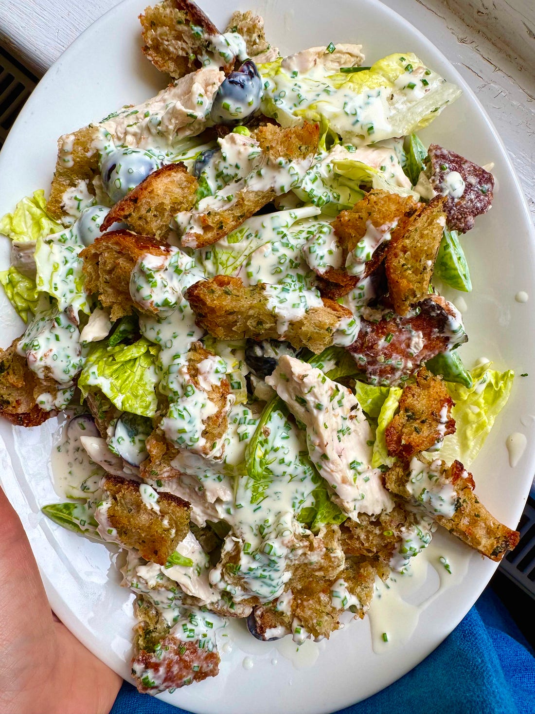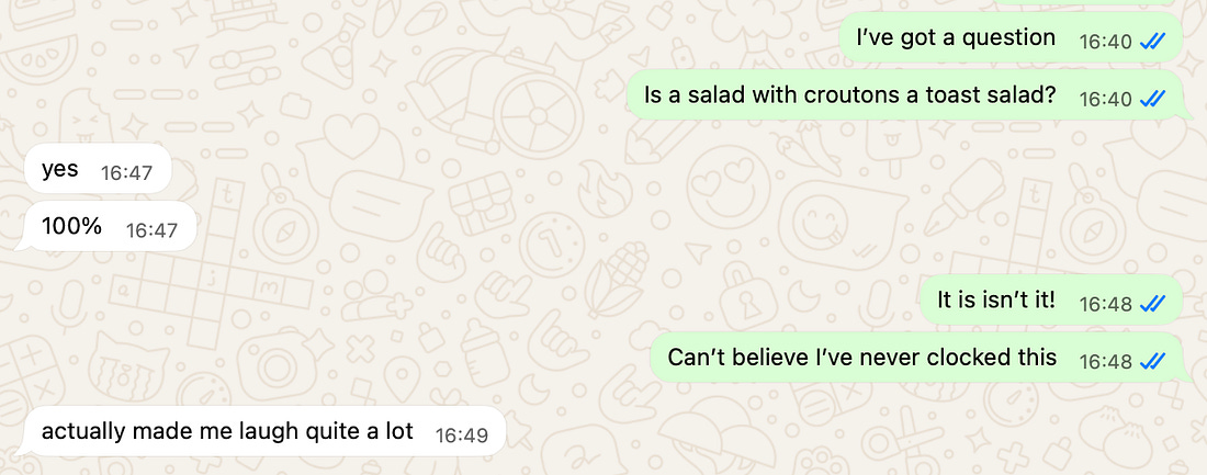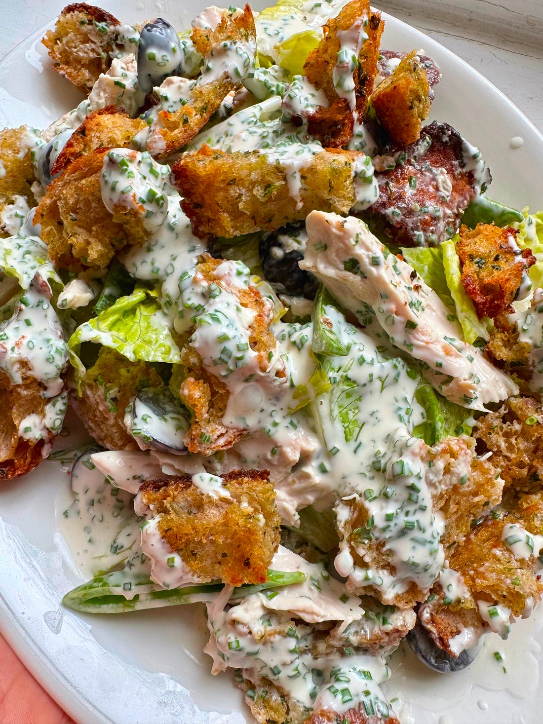 Welcome to Flavour Nuggets! This is the free version of the newsletter. These recipes stay free for 2 weeks, after which they’re auto-paywalled. There’s a second instalment on Fridays for paid subscribers, which contains a brand new recipe. Plus! Paid subs can access the juicy recipe archive, enjoy occasional perks/giveaways, and BTS snapshots of my life as a recipe developer and food writer. All for 87p a week! If that sounds good, go ahead and upgrade by clicking the button below. The other day, it dawned on me: a salad with croutons is a toast salad. OK, fine, if there’s chicken, it’s a chicken salad, but if it’s leaves and croutons, then it’s a toast salad, and I can’t believe I’m the first person to call this out. The toast in today’s salad is elite because it’s also garlic bread. There are many garlic bread crouton recipes online, but they’re often made with dried parsley, garlic powder, and olive oil. Um, no. A garlic bread crouton should be made with fresh garlic, fresh parsley and butter. This is obvious, surely? Another ingredient that makes this salad sing, I think, is the quick-pickled grapes. Chicken and grapes are such a retro combo, but the pickling brings it up to date. I bathe them in red wine vinegar and maple syrup, so there’s some complexity to the sweetness, and I’ve kept a jar of them in the fridge now for a couple of weeks. I have them in sandwiches, on cheese or just slapped onto one of my chaotic snack plates mid-afternoon. I’ve developed this habit because my fridge is filled with the results of at least five recipe tests per day, and you can imagine how this adds up. The neighbourly WhatsApp group of previously guaranteed takers has fallen silent (I’m assuming through fatigue and not that »gasp« they don’t like my food), and my cats are obligate carnivores. My diet is unhinged. This Kyiv-vibes salad held up remarkably well for a day or so; perfect for shovelling into my mouth while I stare down the next pile of ingredients, brew my fourth coffee and contemplate what it might be that I’ve forgotten to do this time. Helen x Roast Chicken Salad with Garlic Butter Croutons 300g roast chicken, torn into hefty chunks Quick-pickled grapes Garlic butter croutons Dressing Preheat the oven to 180°C fan. Melt the butter for the croutons, remove from the heat and add the garlic, parsley and olive oil. Add the sourdough to a bowl, then pour the garlic butter over it and toss to coat the bread. Spread out on a baking tray and cook for 10-15 minutes or until toasted and crisp. Combine all the ingredients for the dressing with some salt and pepper and whisk to combine. Toss the lettuce, sugar snaps, chicken, croutons and dressing together and serve.