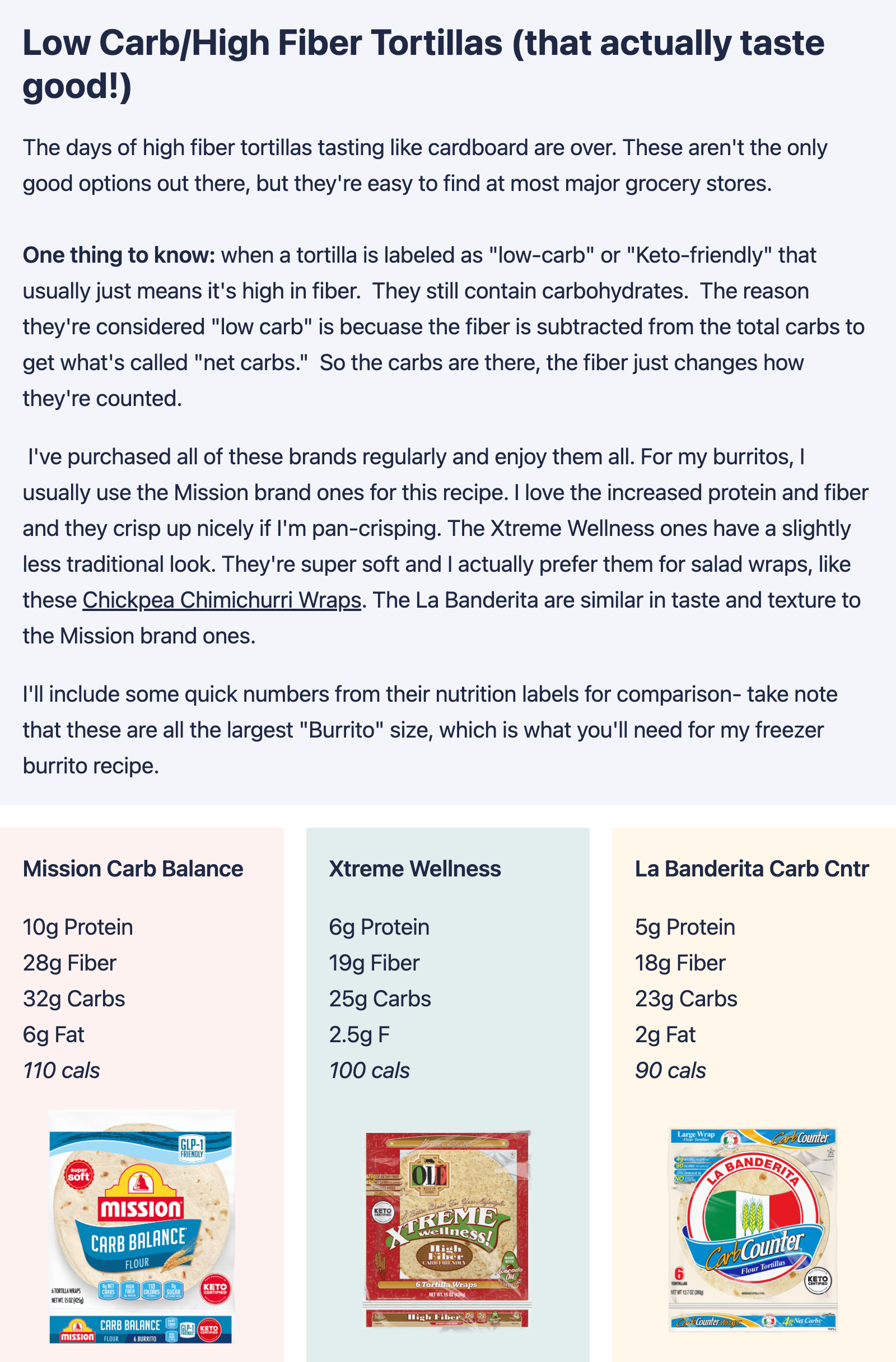 | Hey reader! I was chatting on Instagram stories several weeks ago while assembling these burritos and the internet went wild asking for the recipe. I started making these for my teenage boys so they're very beef-forward and packed with protein. But I find myself grabbing them often for lunch at home, and I'll even wrap the end and take it hand-held on the go sometimes! If I'm at home I love stuffing in a couple slices of avocado and a dollop of sour cream or plain Greek yogurt. I loaded this blog post with so much information, including a section on low carb/high fiber tortilla options you can find at the grocery (preview below), and several different freezing methods. I hope you'll check it out and enjoy another option for meal prep! xo, Sara | |