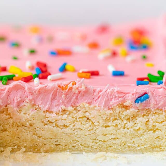 These cookie bars are sweet and chewy like your favorite sugar cookies, but made into delicious and shareable bars. Top with pastel frosting and sprinkles for a finishing touch!