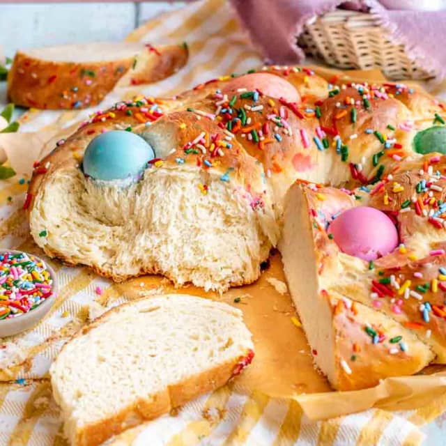 Enjoy this sweet, festive braided yeast bread baked with colorful Easter eggs nestled in the dough! This is perfect for Easter breakfast or a dessert to share this Spring.