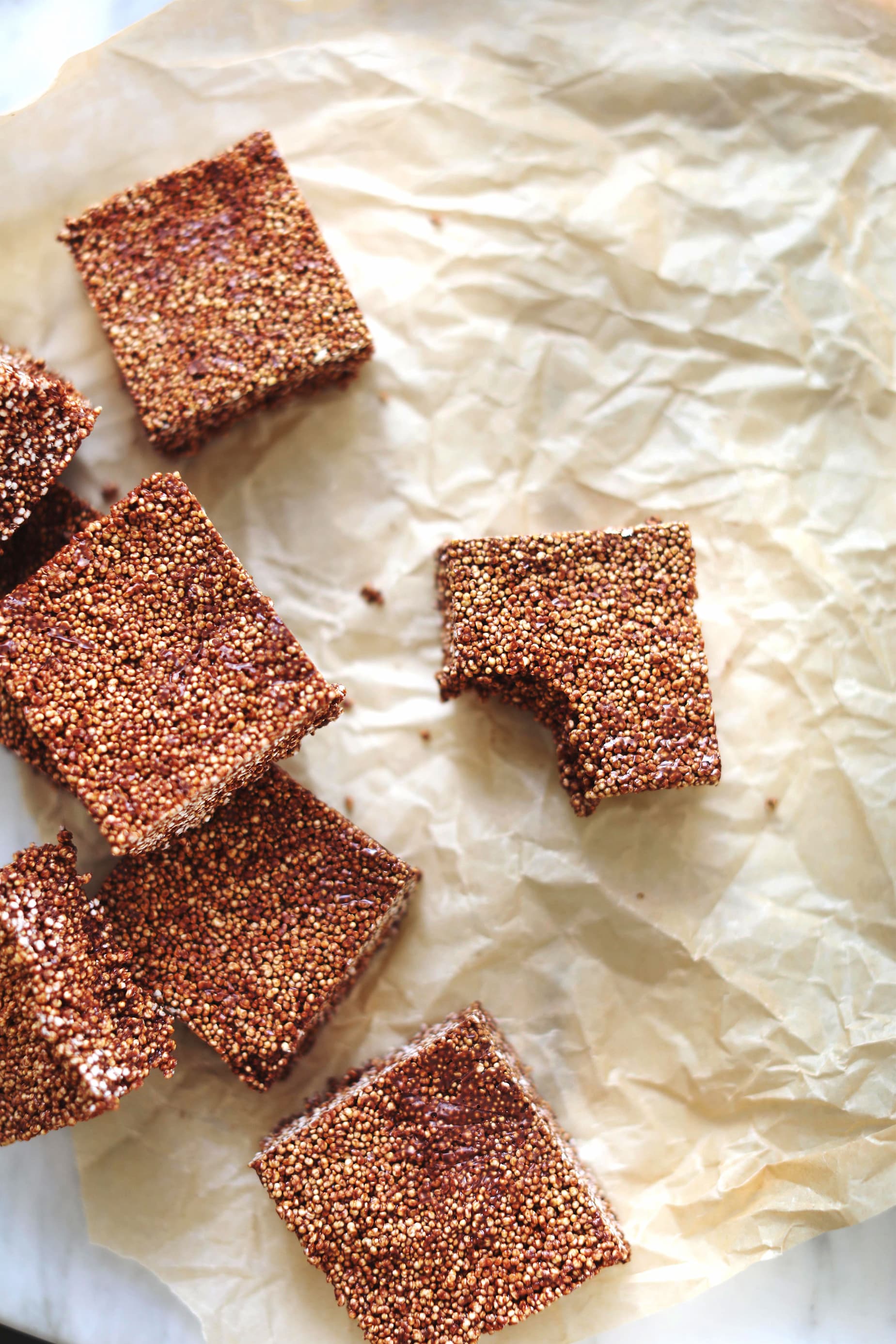 These bars were inspired by a dessert that is made by the chefs at our retreat in Mexico, that our guests always go wild for. Popped amaranth candies are a popular Mexican treat called algerรญas, meaning "joy". Their origins date back to the 16th century, and are still made today. Alegrรญas have become the most popular way of consuming amaranth in Mexico. They are prepared by puffing the seeds in a hot pan without oil - which you will practice too! The popped amaranth is mixed with honey or sugar syrup and sometimes peanuts, seeds, or chopped dried fruits. For my version, I am using peanut butter and chocolate, with just a hint of spice. The chilies are optional, but they really add an unexpected layer of flavour! Popping amaranth is very easy. The two most important things to remember are getting your pan up to temperature first, and working in batches - about a tablespoon at a time - to avoid crowding. When the temperature is right, the amaranth will pop right away and will only take about 20 seconds. | | INGREDIENTS 6 Tbsp. / 100g amaranth 1 Tbsp. expeller-pressed coconut oil generous pinch chilies flakes, to taste 80g dark chocolate (75% cacao solids or higher) 1/4 cup / 60ml creamy unsweetened peanut butter, preferably organic 1 Tbsp. raw honey 1 generous pinch flaky salt, to taste 1/2 tsp, vanilla extract DIRECTIONS: 1. Line a loaf pan with parchment paper or plastic wrap. 2. Heat a large skillet over medium-high until hot. Working one tablespoon at a time, add the amaranth to the pan, cover with a lid, and let pop until all the seeds have opened - about 20 seconds per batch. Transfer each batch to a large bowl and repeat until you've popped all of the amaranth. Set aside. 3. Make a double boiler over medium heat. Add the coconut oil and chilies, allow to melt and stir. Roughly chop the chocolate and add it to the bowl, stirring occasionally until fully melted. 4. Stir in the peanut butter, honey, salt and vanilla. 5. Pour this mixture over the popped amaranth and stir thoroughly to combine. Press this mixture into the prepared loaf pan, then place in the fridge or freezer to firm up. 6. Once fully cool, remove from the pan and cut into eight equal portions (or more!). Say thank you and enjoy. Store leftovers in the fridge for up to two weeks. | | | | |