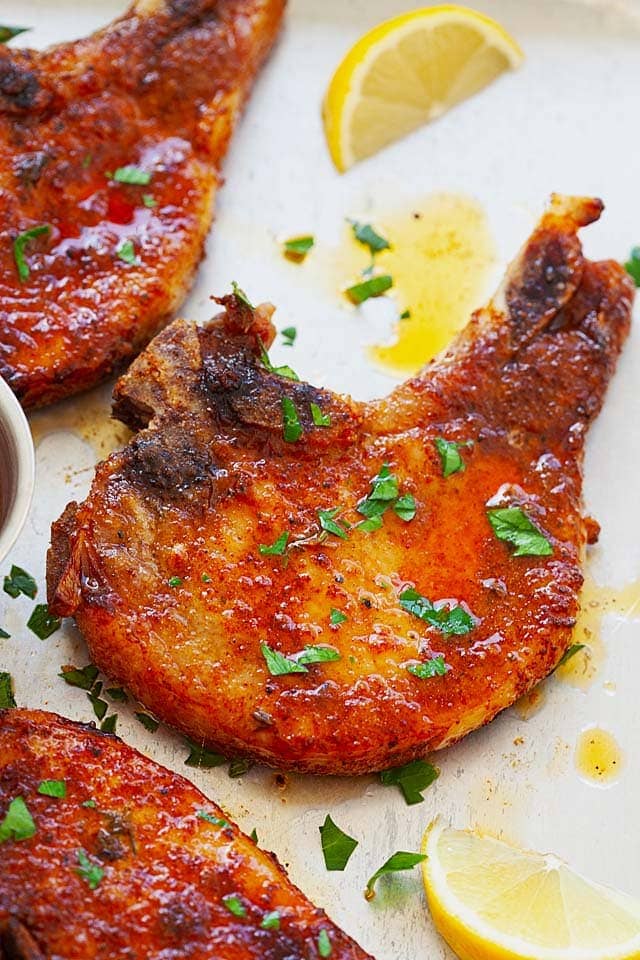 These pork chops are juicy, flavorful, and they need just 5 minutes of prep time before going in the oven. Some nights that's all I have!