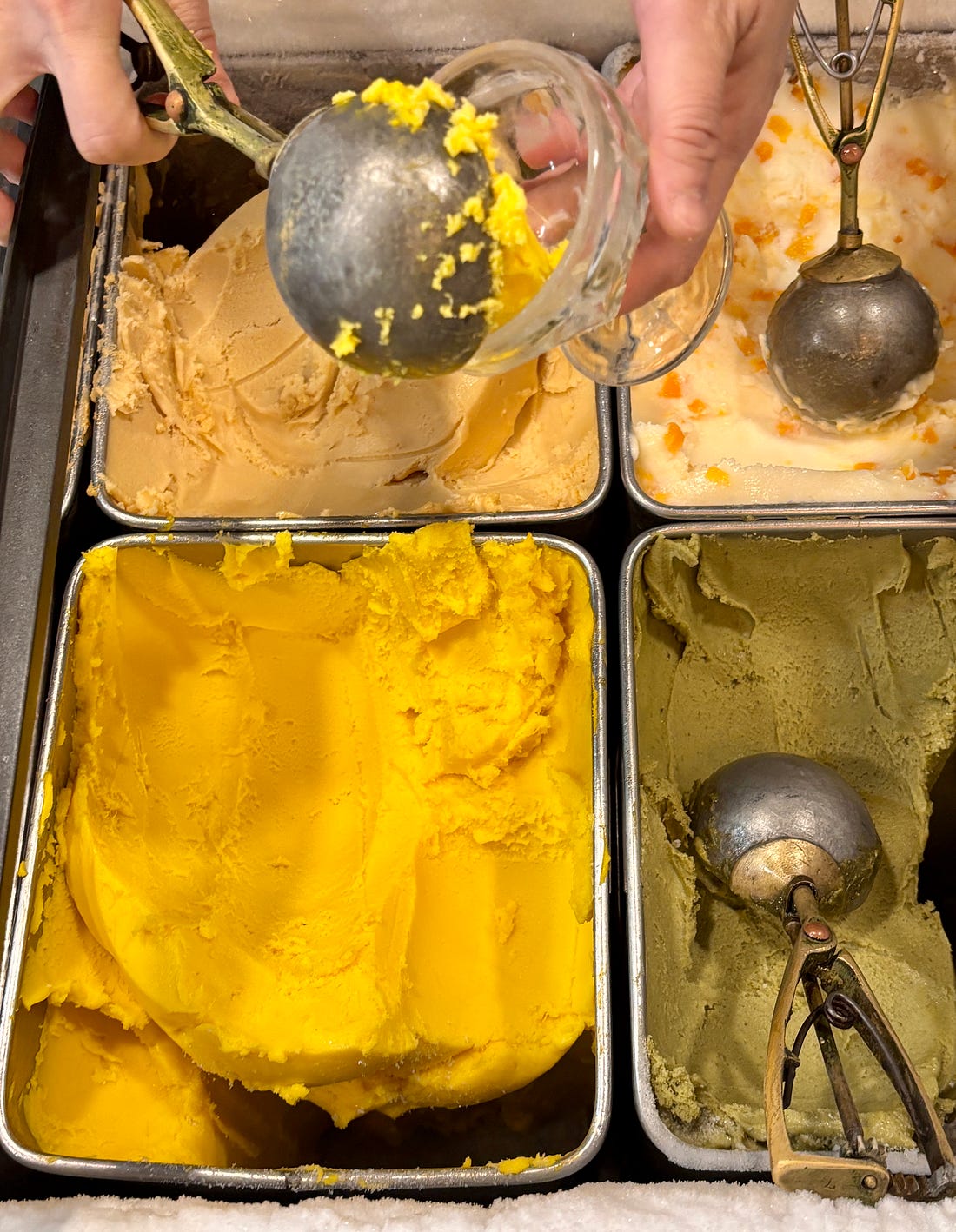 When I ordered seven scoops for the three of us, I figured each bowl would be a grouping of two or three smaller scoops, but we ended up with seven separate, generous bowls, and scoops, of ice cream.