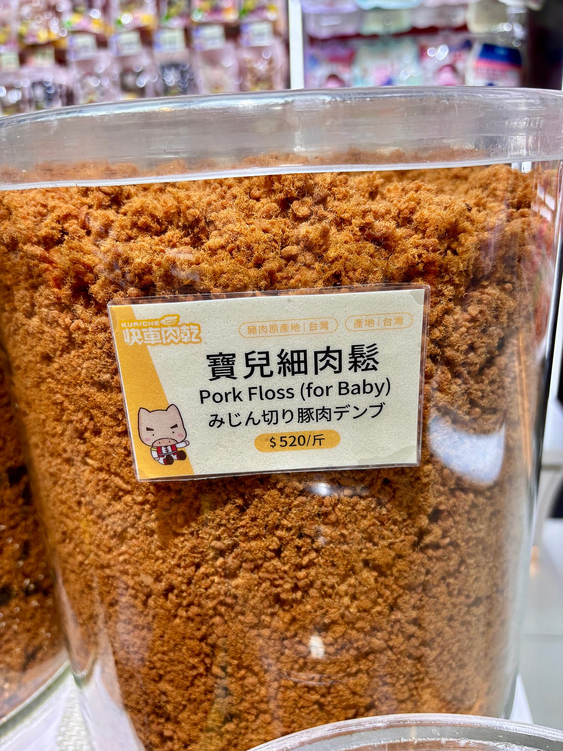 Pork floss is very popular in Taiwan. I saw this at the Nanmen Market. If anyone knows why there is special pork floss for babies, let me know!