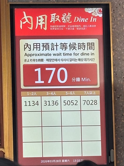 If you go, and it’s definitely worth it, avoid weekends. I did notice their branch at the 101 Taipei Tower had just a one-hour wait time, and I think you can browse in the mall while you wait (on their website, they list waiting times for each branch as well), but they also have a take-out, and I saw people eating their dumplings in the nearby park.