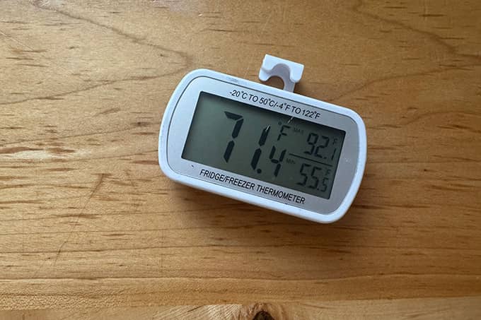 Note: The thermometer is not oven-safe — it can withstand heat up to 122ยบF. I move it in and out of my oven, and I have one in my fridge, too. I found that my oven (not turned on and without the light on) was quite a bit warmer than the ambient temperature of my kitchen (which was more like 71ยบF). And sometimes (when the lower oven was on), it got dangerously warm (for a starter).