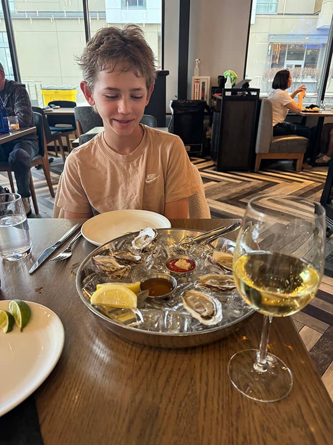 Friends, hello. I spent last weekend in Boston with my son, Graham. On Saturday night, we decided to try the restaurant next door to our hotel. It looked busy, a promising sign, and to our luck, the hostess had a table for two for immediate seating. Sizing us up, she grabbed a hardcover menu for me and a paper menu with crayons for Graham. Graham is 14 and very short, and this is not the first time a server has mistaken him for a much younger child. Upon seeing the crayons, Graham politely told the hostess he didn't need a kids' menu, and they both laughed as she led us to our table. Shortly after sitting, our server came by to give us the rundown of the menu, including the oysters of the day, and I ordered a half dozen immediately. Upon hearing this, our server paused and, looking at Graham, asked: "You like oystahs?" Graham nodded as he listened intently to the server, who, in his thick Boston accent, went on to describe his own son, who, like Graham, is an adventurous eater. After he left, Graham looked at me, smiling while shaking his head, and asked: "What kind of an accent is that? Australian?" I was dying. Clearly, we have not spent enough time in Boston. Anyway, Friends, it made me laugh.