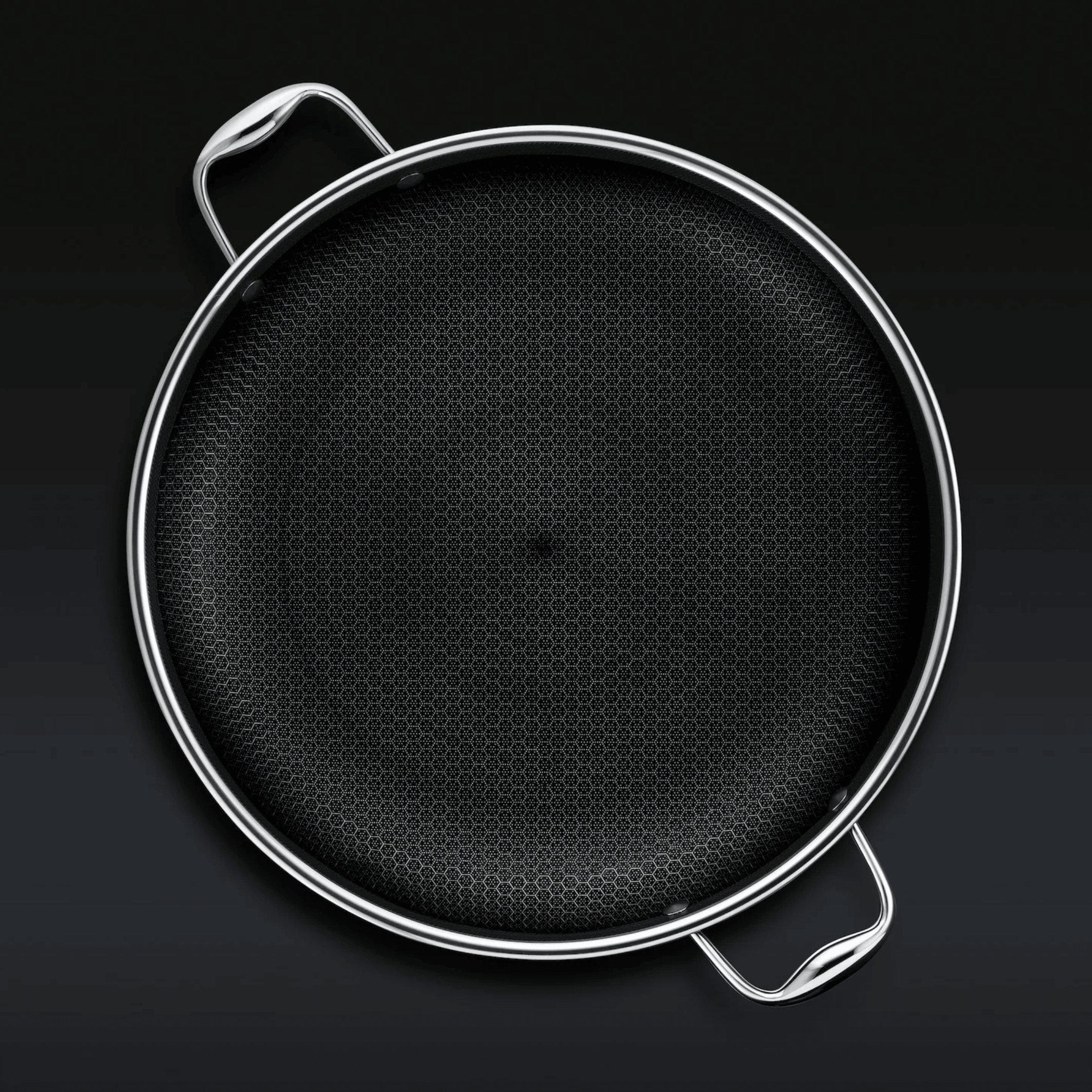 The standard large kitchen skillet is 12-inches (that's also an essential pan, we'll get to it below!) But for larger households like mine, a family of 6, that is simply not large enough for a lot of tasks- skillet meals, for example. High quality 14" skillets are a little tricky to find, but this Hexclad one is phenomenal.