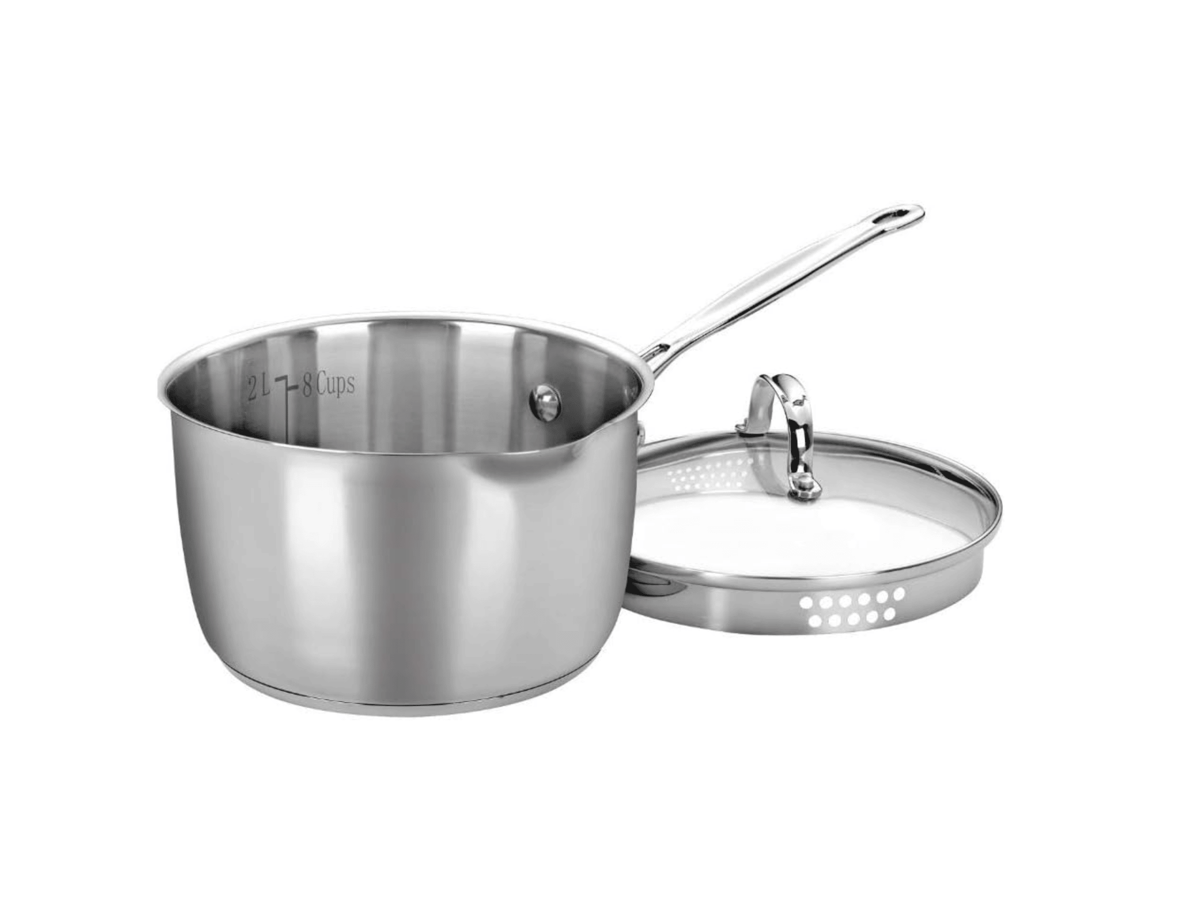 I've had this pan for over 15 years and it's one of the most-used. The stainless steel looks just as great as the day I bought it. If you ask my kids what this is, they'd say it's the macaroni and cheese or ramen pot haha. It's 3 quarts, which I think is not too big and not too small. I'm grabbing it to boil pasta, heat soups and sauces, hard boil eggs, make dessert sauces, blanch vegetables, and more. The best feature is in the lid. The pan itself has a handy little pour spout, and the list twists around to reveal some holes. This means you can boil pasta or simmer vegetables and then just strain the water out into the sink without the need for a colander. It makes things super quick and easy and saves time while you're cooking.