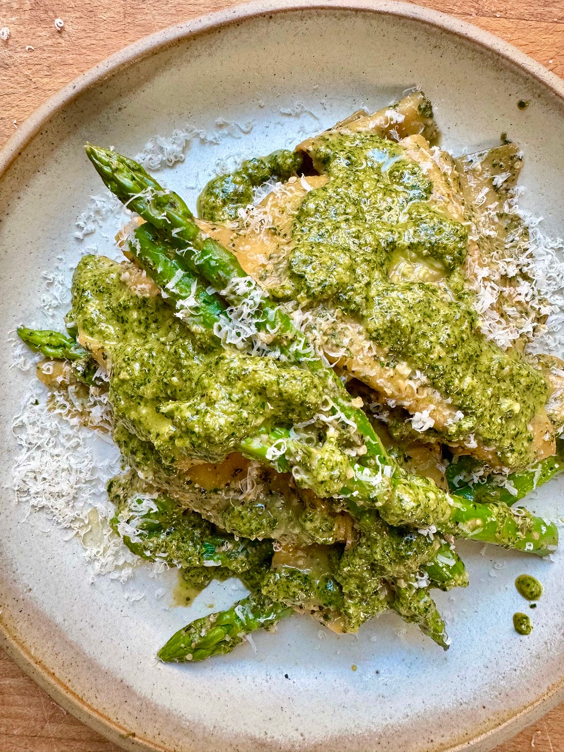 Welcome to Flavour Nuggets! This is the free version of the newsletter. These recipes stay free for 2 weeks, after which they’re auto-paywalled. There’s a second instalment on Fridays for paid subscribers, which contains a brand new recipe. Plus! Paid subs can access the juicy recipe archive, enjoy occasional perks/giveaways, and BTS snapshots of my life as a recipe developer and food writer. All for 87p a week! If that sounds good, go ahead and upgrade by clicking the button below. Before we kick off, a quick reminder about the Food and Print fair that’s happening THIS SATURDAY! Come along and find your new favourite food publication, and do say hello if you make it; I’d love to meet you. Here are all the details. Mint? In pesto? (Garlic? BREAD?!). If you haven’t tried this springy variation, here’s your prompt. The key is balancing the mint with a little parsley so it’s not like pasta with mint sauce. Except it sort of is that? The mint also brings out the slight pea flavour of the asparagus, and it’s all around giving crisp, dewy mornings and a renewed zest for life. The sun is out. It’s April. We have survived. People with more time on their hands would make the pasta here, obviously, but I do not have that kind of timesink allowance in my schedule. So I cheat. If you want to make your own pasta, then yes, a superior result will be your reward. If you have a couple of hours to spend mixing, rolling and hanging, then I’m sure it’s very meditative. How cosy, how domesticated, how romantic; but sorry, for me, it’s a no. I only made fresh pasta, like, once during lockdown ffs. The days of my ‘project cooking’ have passed. I now proudly stick my flag in the quick-and-easy camp and leave the rest to chefs in their restaurants. Who has the resources to spend hours making dinner? In this economy?! The trick here is to buy fresh lasagne sheets and cut them in half. They cook in a couple of minutes. However, if you have a box of dried lasagne sheets knocking about, you can absolutely snap a few of those and boil them up, no problem. Obviously, they’ll take a bit longer. What could be better than cracking some dusty leaves into your cauldron, then passing them off as ‘silk handkerchiefs’? An aspirational level of cheek. Helen x Silk Handkerchiefs, Mint Pesto and Asparagus 250g fresh lasagne sheets Mint Pesto Whack everything for the pesto into a blender with a pinch of salt and whizz to a pesto consistency. Add more salt if you need it, which you probably will. Cook the asparagus in the boiling water for 2-3 minutes, depending on thickness (err on the side of caution), then lift out with tongs and immediately plunge into the bowl of cold water. Add the pasta sheets to the boiling water and cook for a couple of minutes. In a frying pan, gently warm a good dollop of the pesto, then add a ladleful of pasta cooking water to loosen it up. Transfer the sheets and asparagus to the frying pan, toss to combine. Serve immediately, garnished with Parmesan if using.