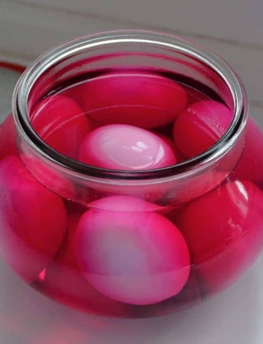 Peel your boiled eggs and give them the quick-pickle treatment here. Beautiful and delicous.