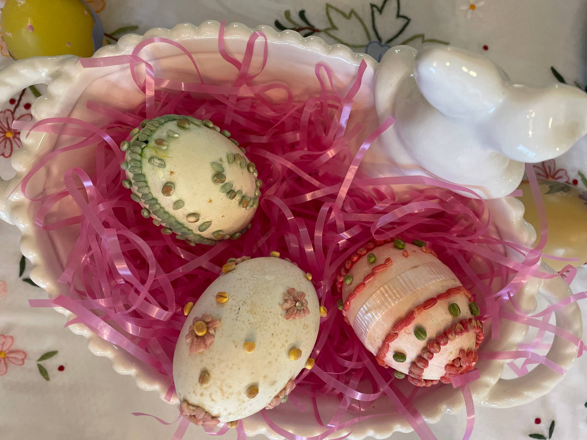 A table filled with love: Alice Abowd, Mom's mom, blew out these eggs and decorated them with colored rice and ribbons. Family treasure, and just one of the many crafts she mastered.
