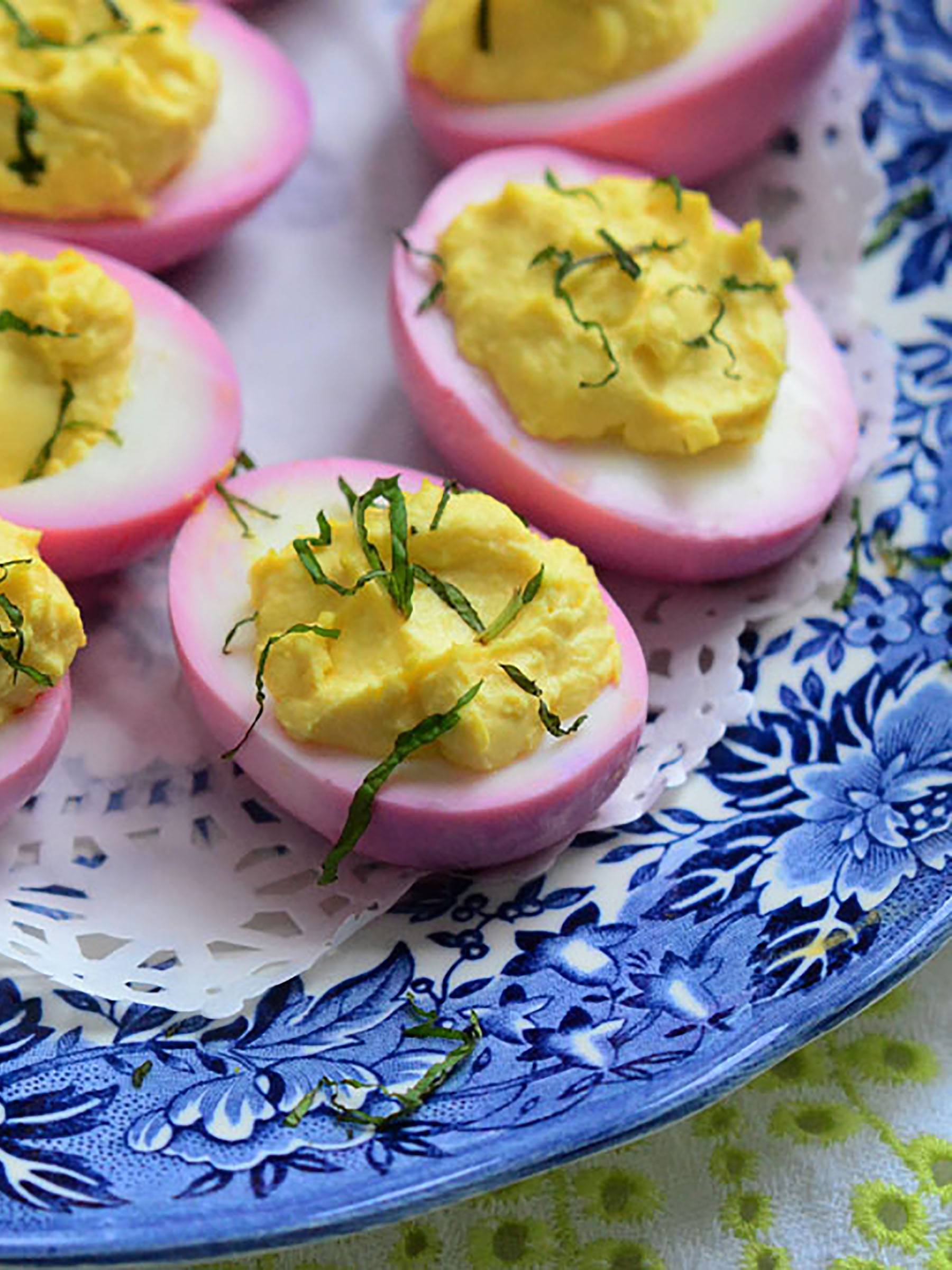Use your boiled eggs or pink pickled eggs to make a lush plate of deviled eggs. My filling gets its creaminess from yogurt, and that's our mint on top. So nice!