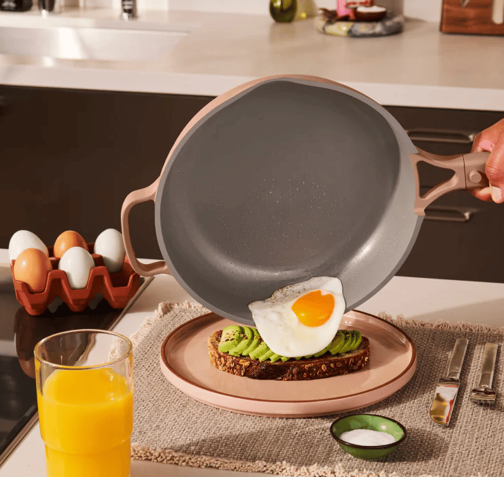 I love this Caraway pan when I am cooking a bigger batch of food like a stir fry with volume from veggies, batch cooking an egg scramble, cooking a bigger piece of fish, it's amazing. Deep, high sides, great lid, truly nonstick! So many great colors!